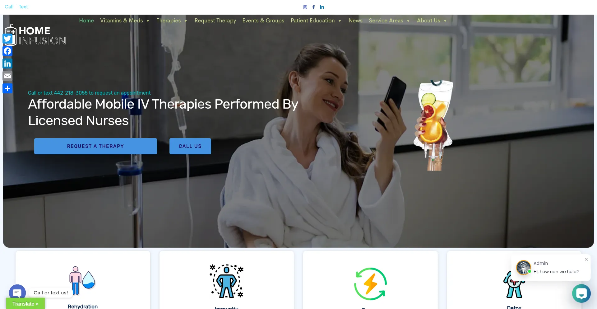 Affordable mobile IV therapy in CA, AZ, TX, FL, OR, CO, OK, NC & GA. Licensed nurses deliver hydration & vitamin drips. Call/text (442) 216-0948 – Open 24/7.