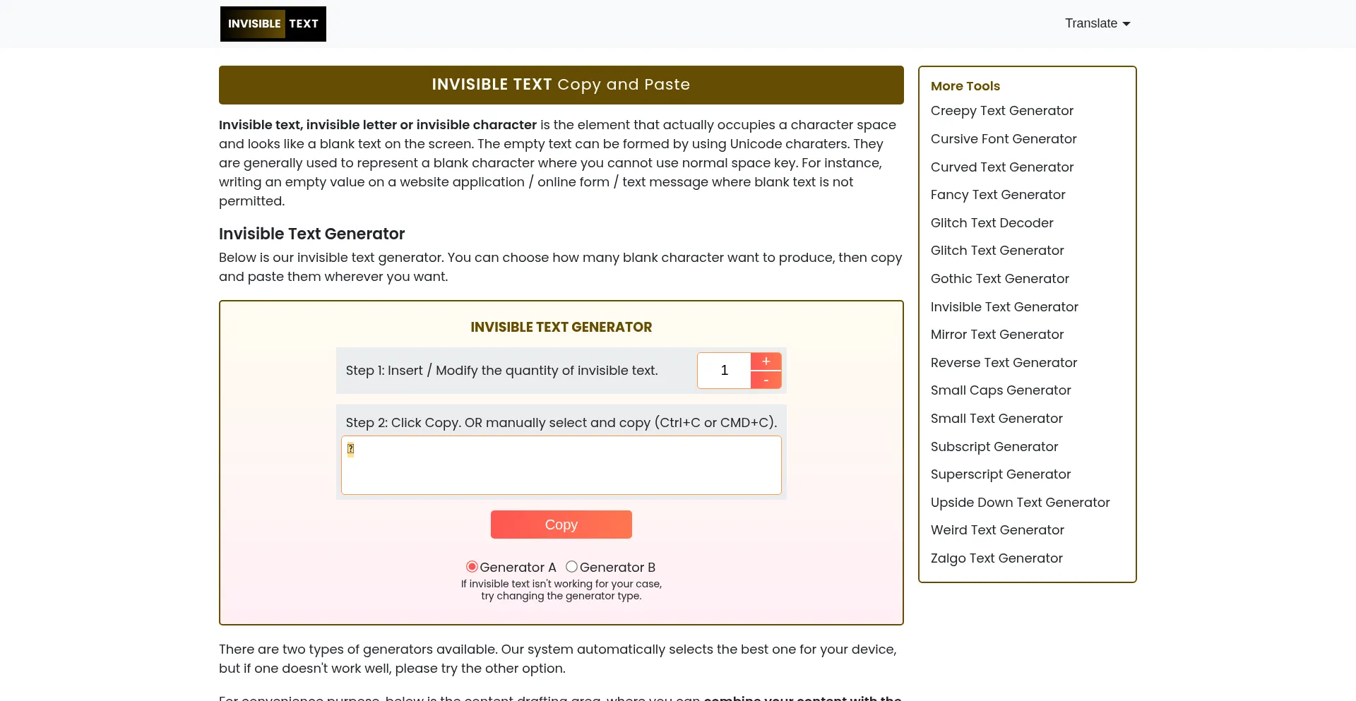 Generate invisible text using Unicode characters for blank space. Easily copy and paste invisible character for WhatsApp, Discord, etc. Free and user-friendly!