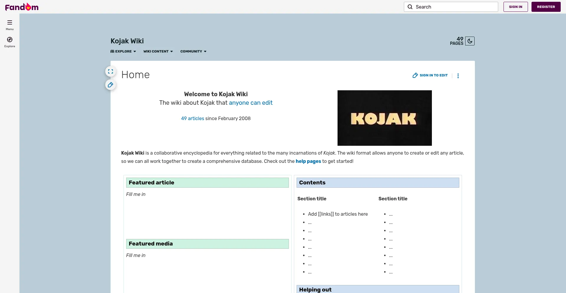 Kojak Wiki is a collaborative encyclopedia for everything related to the many incarnations of Kojak. The wiki format allows anyone to create or edit any article, so we can all w...