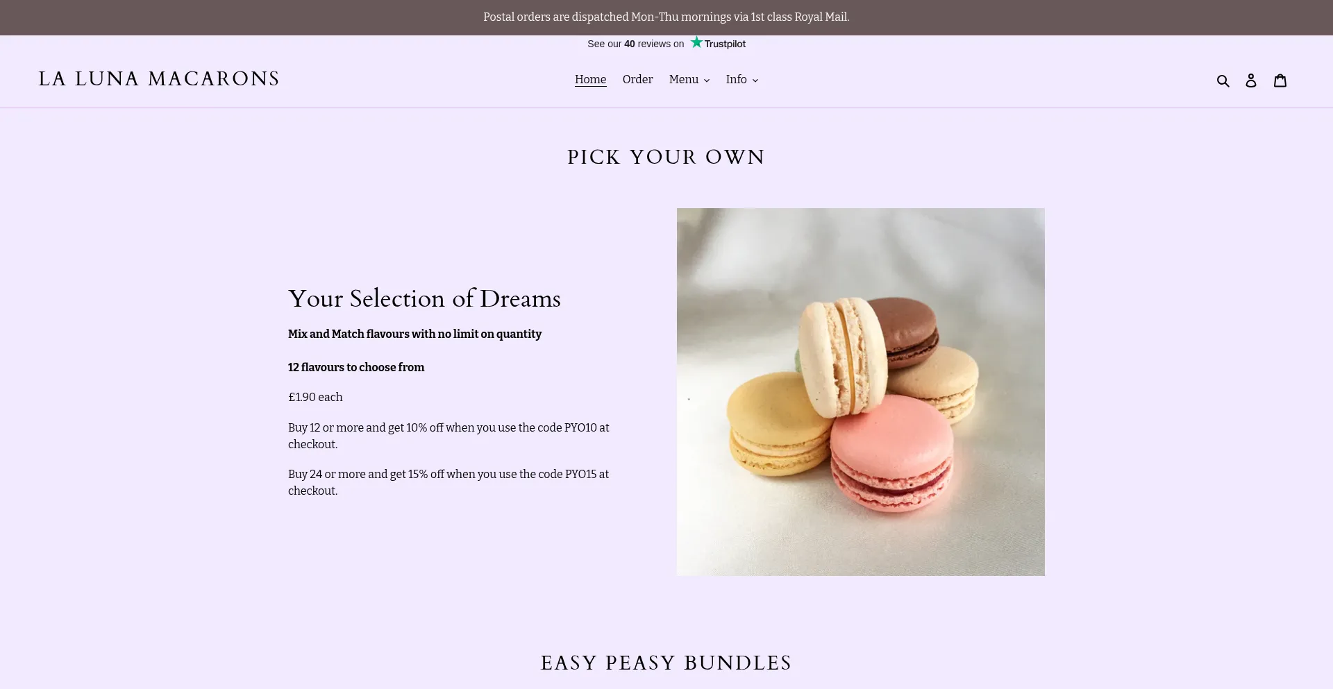 Specialty bakery selling Italian meringue macarons handmade locally in Highwoods, Colchester. Available nationwide (UK mainland) via Royal Mail 1st Class.