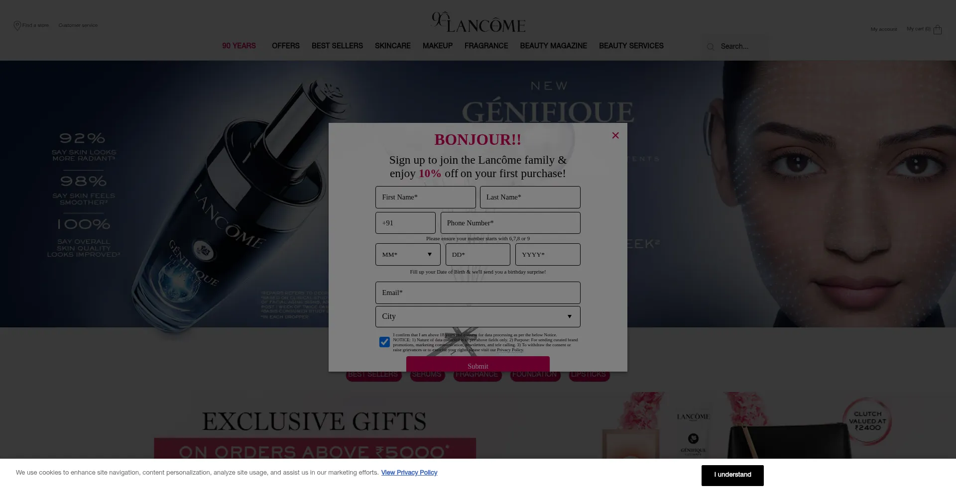 Le site web implémente des mécanismes de consentement aux cookies en conformité avec les réglementations de confidentialité telles que RGPD ou CCPA. Cela démontre que lancome.in adhÚre aux standards de protection des données et fournit aux utilisateurs un contrÎle sur les pratiques de collecte de données personnelles.