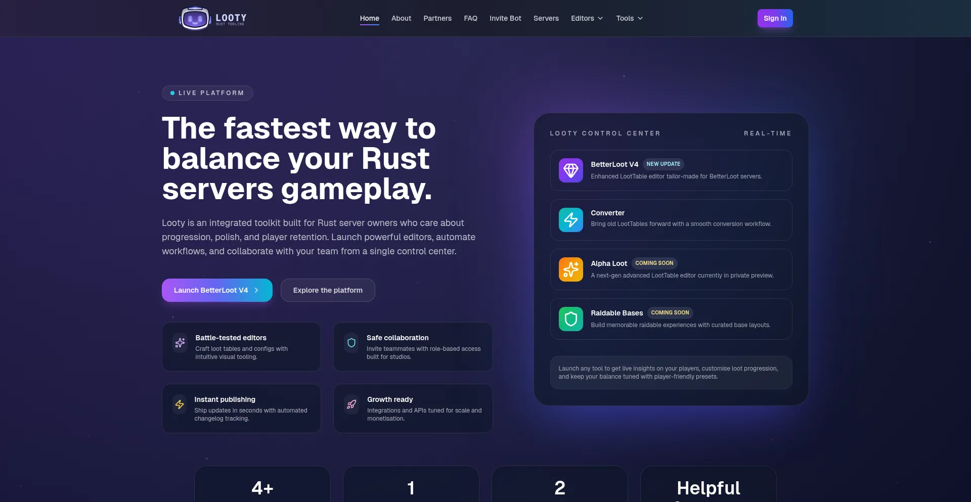 Discover the Looty toolkit for Rust servers — BetterLoot editors, converters, databases, and partner integrations that keep your loot balanced and players engaged.