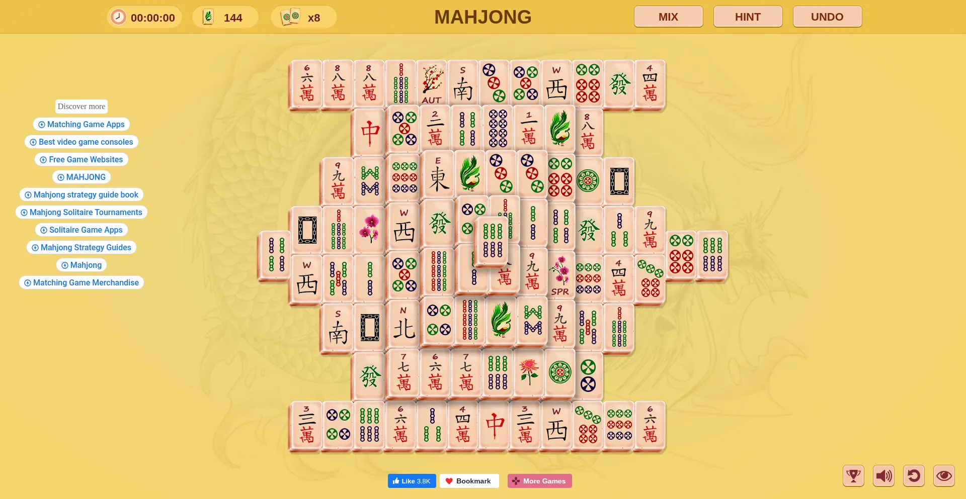 Play Mahjong Solitaire for free! The game can be played online in your browser, without any download or registration, is full screen and keeps track of your personal statistics.