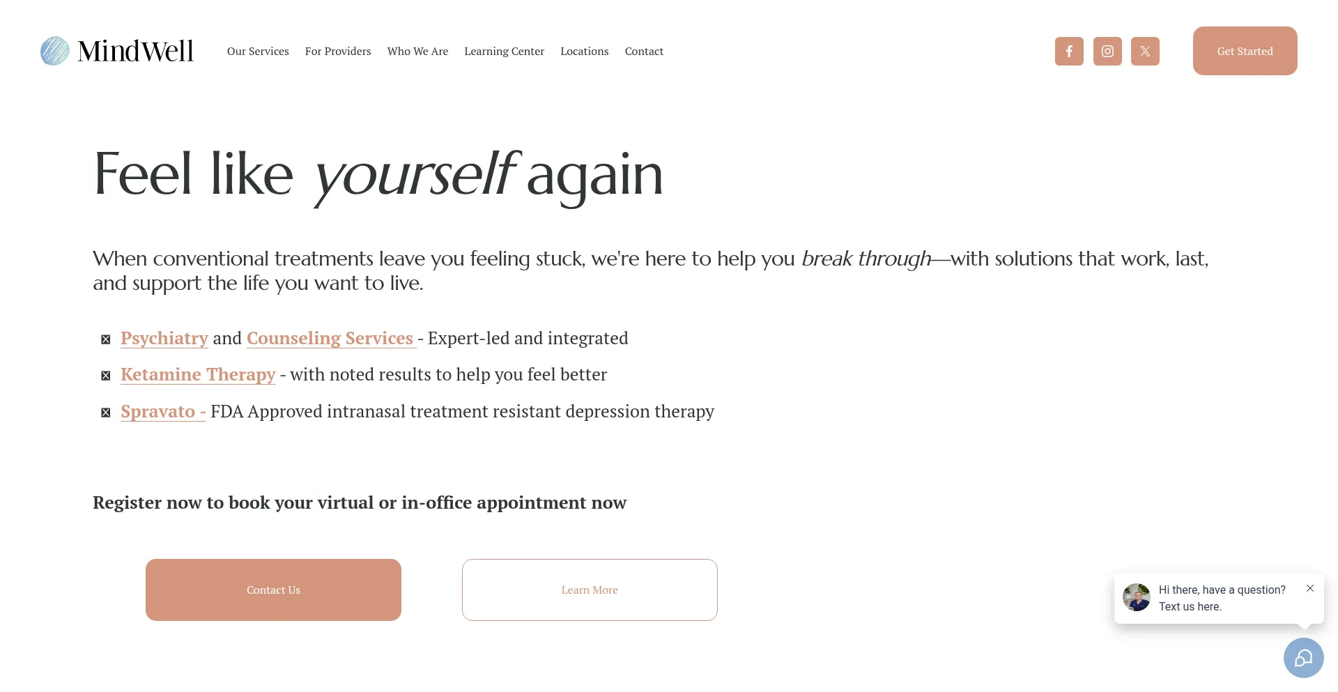MindWell Health offers expert mental health services including IV and home ketamine treatments, Spravato esketamine, comprehensive psychiatry, counseling and weight management...