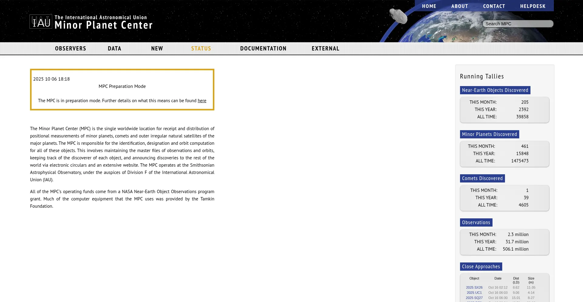 We are the official body that deals with astrometric observations and orbits of minor planets (asteroids) and comets.
