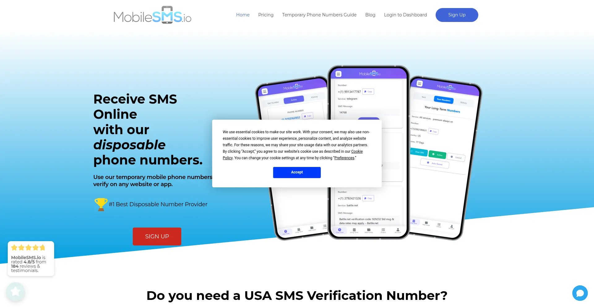 Get reliable disposable phone numbers to receive SMS online at MobileSMS.io. Perfect for receiving SMS verification codes, short-term temporary use and long-term rentals. Try now!