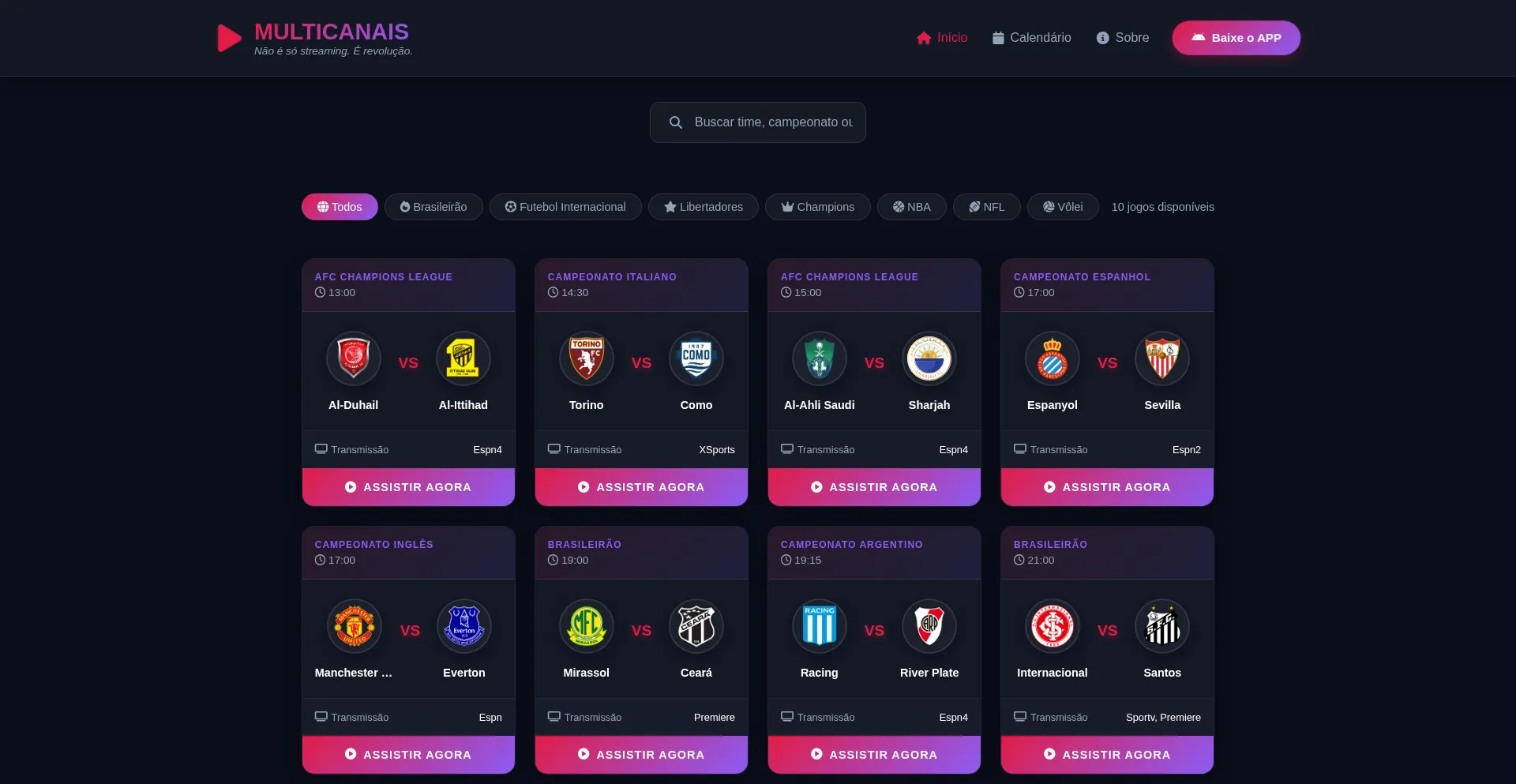 Assista jogos ao vivo no multicanais. Futebol, vĂŽlei, basquete e as melhores ligas esportivas do mundo. BrasileirĂŁo, Libertadores, Champions League, NBA, NFL, MMA, Futebol, Go...