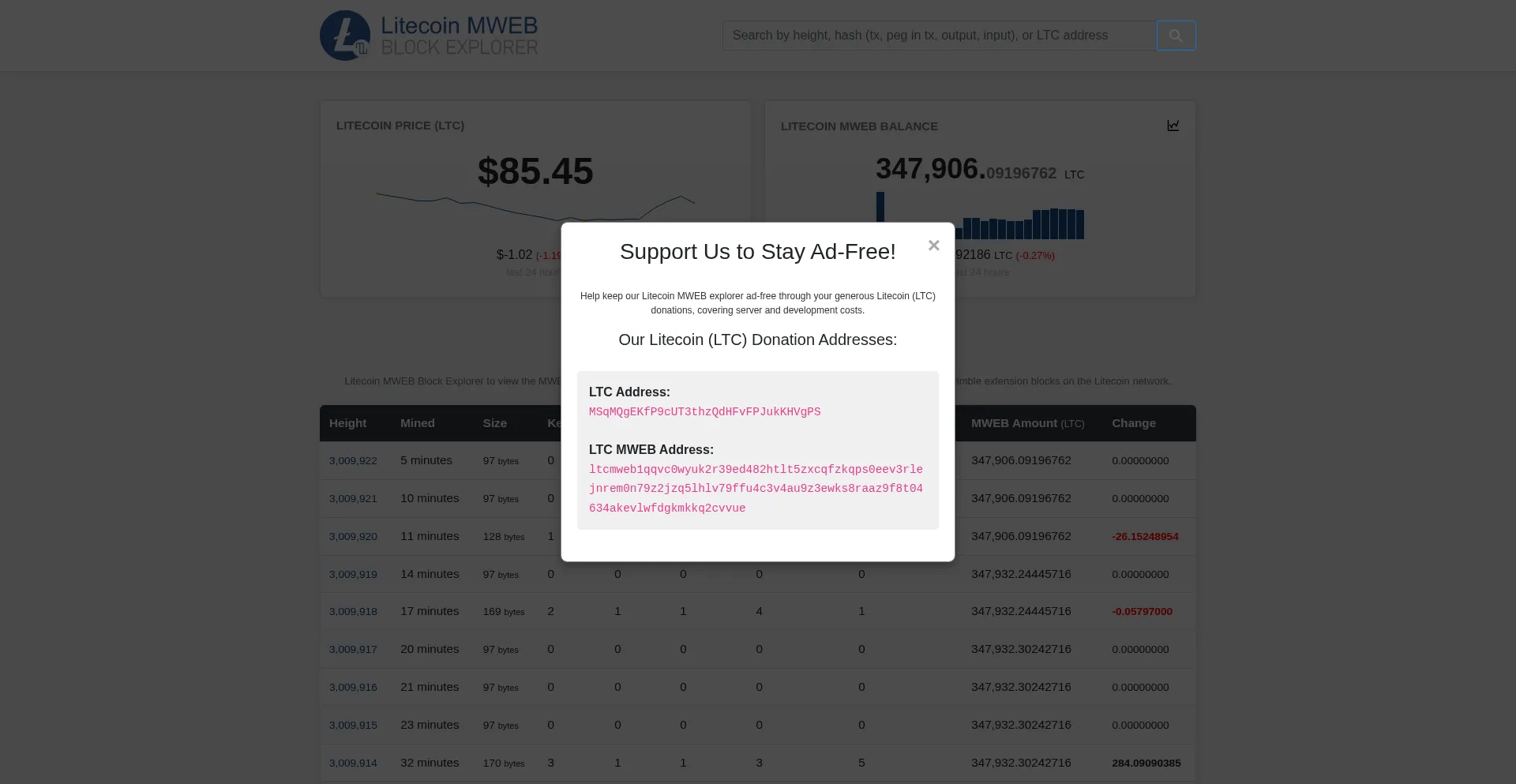 Litecoin MWEB Block Explorer to view the current MWEB Litecoin balance and all the validated Mimblewimble extension blocks on the Litecoin network.