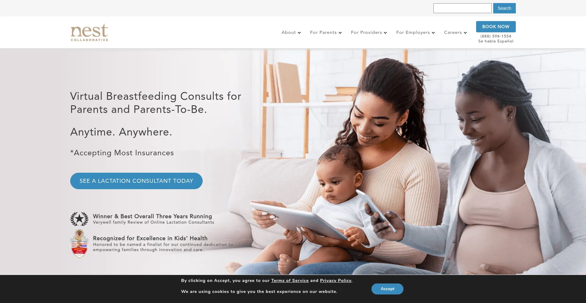 Nest Collaborative offers online lactation consults. Virtual appointments are available same-day & are covered in full by most insurance plans.
