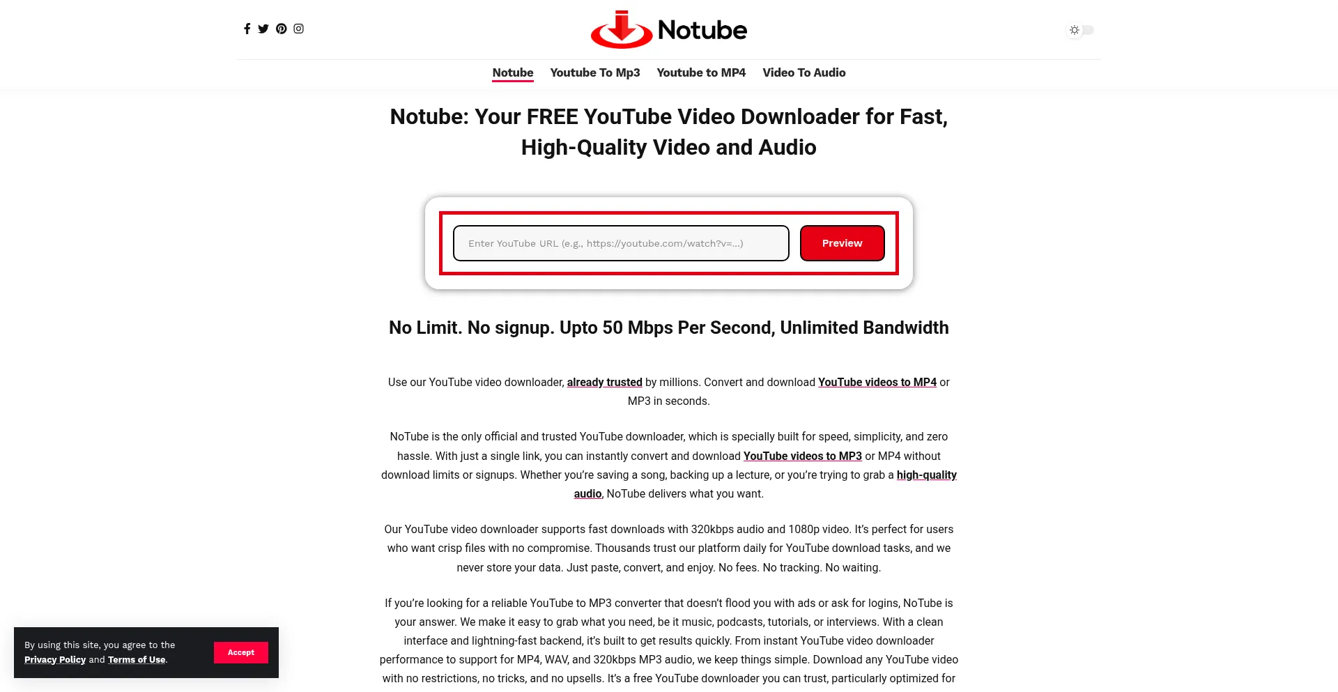 Download YouTube videos for free with Notube. Fast and only no limit YouTube downloader for MP4, MP3, and more. No registration needed — just paste and download!