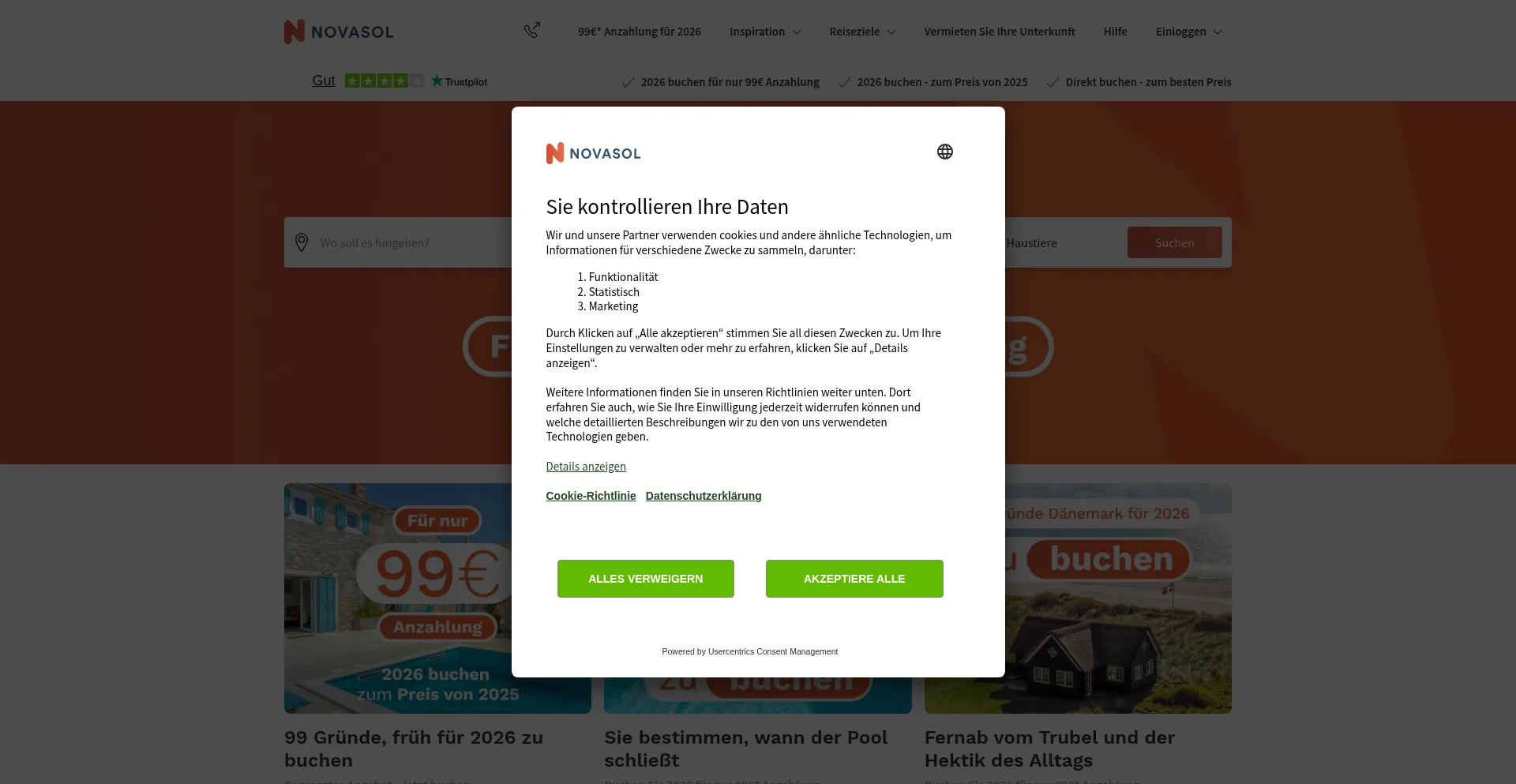 Aus 50.000 FerienhĂ€usern in Europa wĂ€hlen, denn es gibt 99 GrĂŒnde, bei NOVASOL zu buchen. Urlaub fĂŒr 2026 mit einer Anzahlung von nur 99€* sichern.