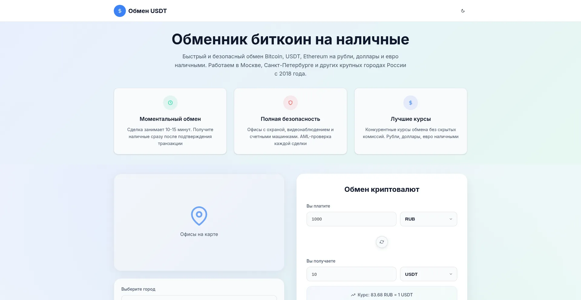 Надежный обменник биткоин и других криптовалют на наличные деньги. Моментальный обмен BTC, USDT, ETH н...
