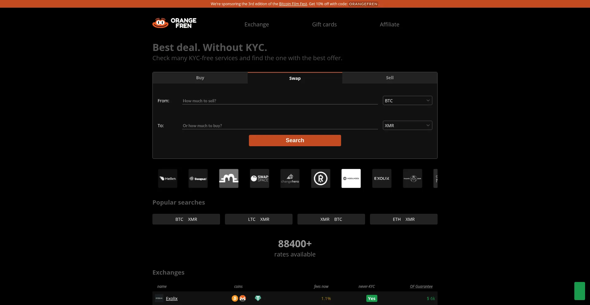 OrangeFren.com compares instant exchanges, atomic swaps, P2P exchanges, prepaid cards and OTC brokers to find you the one with the best exchange rate.
