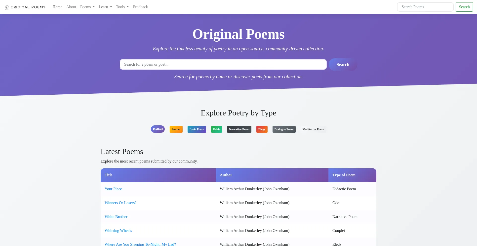 Explore the timeless beauty of poetry in an open-source, community-driven collection. Search by poet or poem name, and discover a wide variety of poetry types.