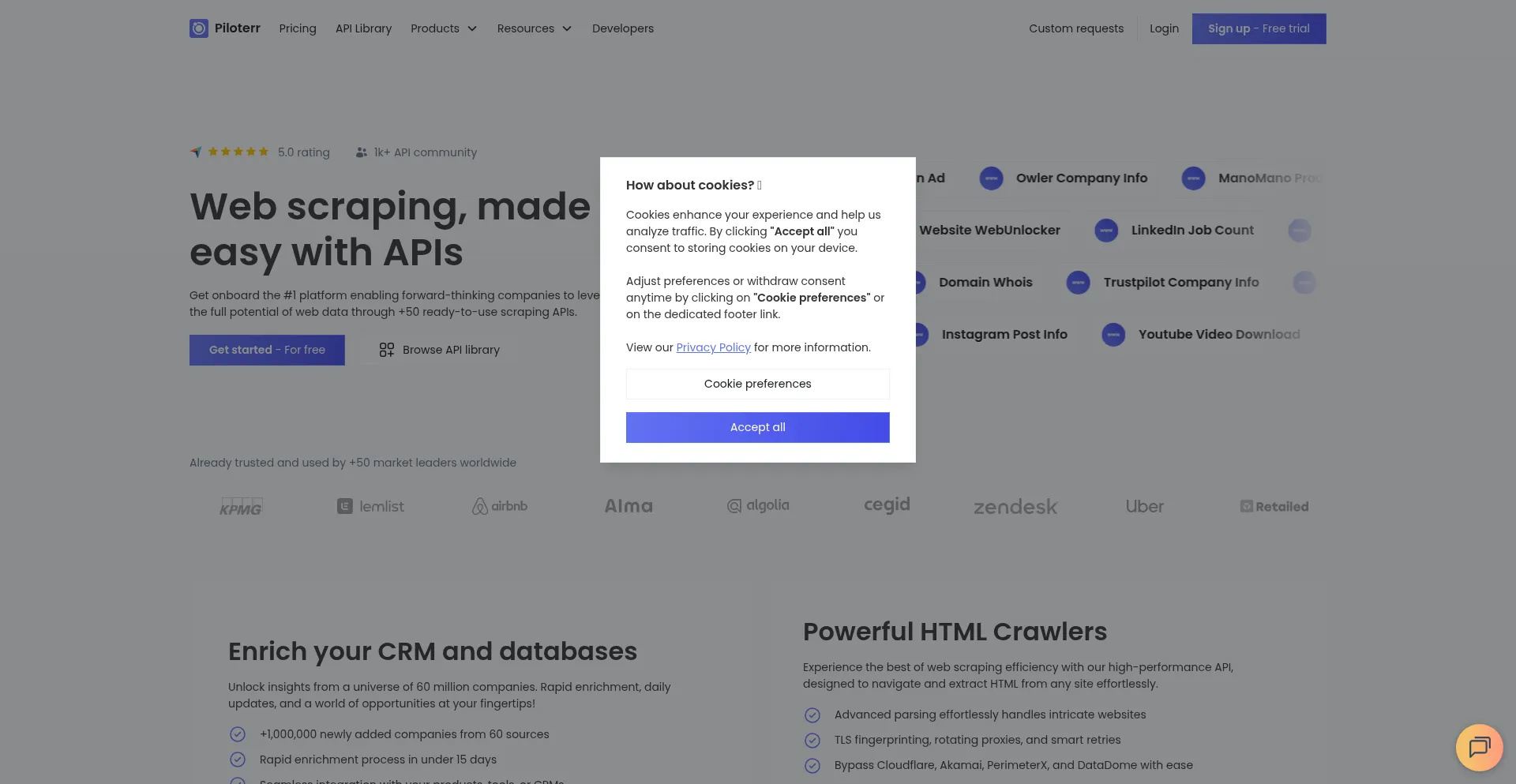 Piloterr manages proxy rotation, browsers, anti-bots, and captchas, allowing developers to scrape any webpage with a single API request. Enjoy 50 free API calls!