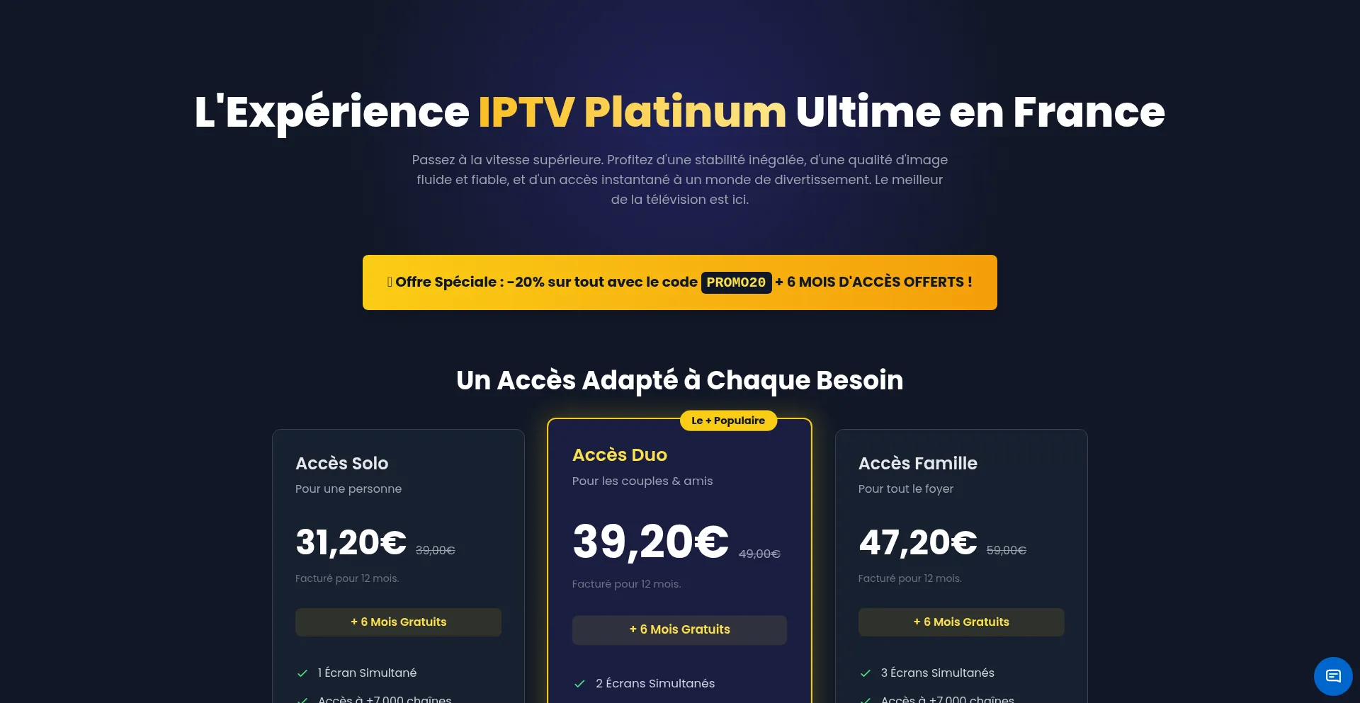 Découvrez IPTV Platinum, l'expérience TV premium en France. Serveurs fluides et fiables, livraison des accÚs par e-mail en quelques minutes. Offre : 18 mois au prix de 12.