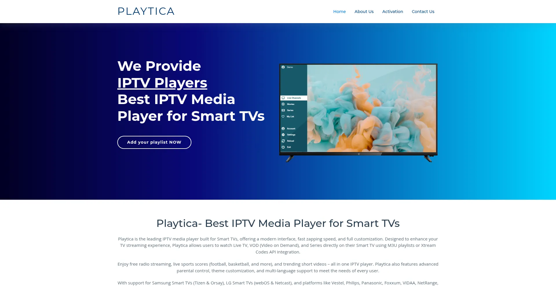 Playtica is the leading IPTV media player built for Smart TVs, offering a modern interface, fast zapping speed, and full customization.