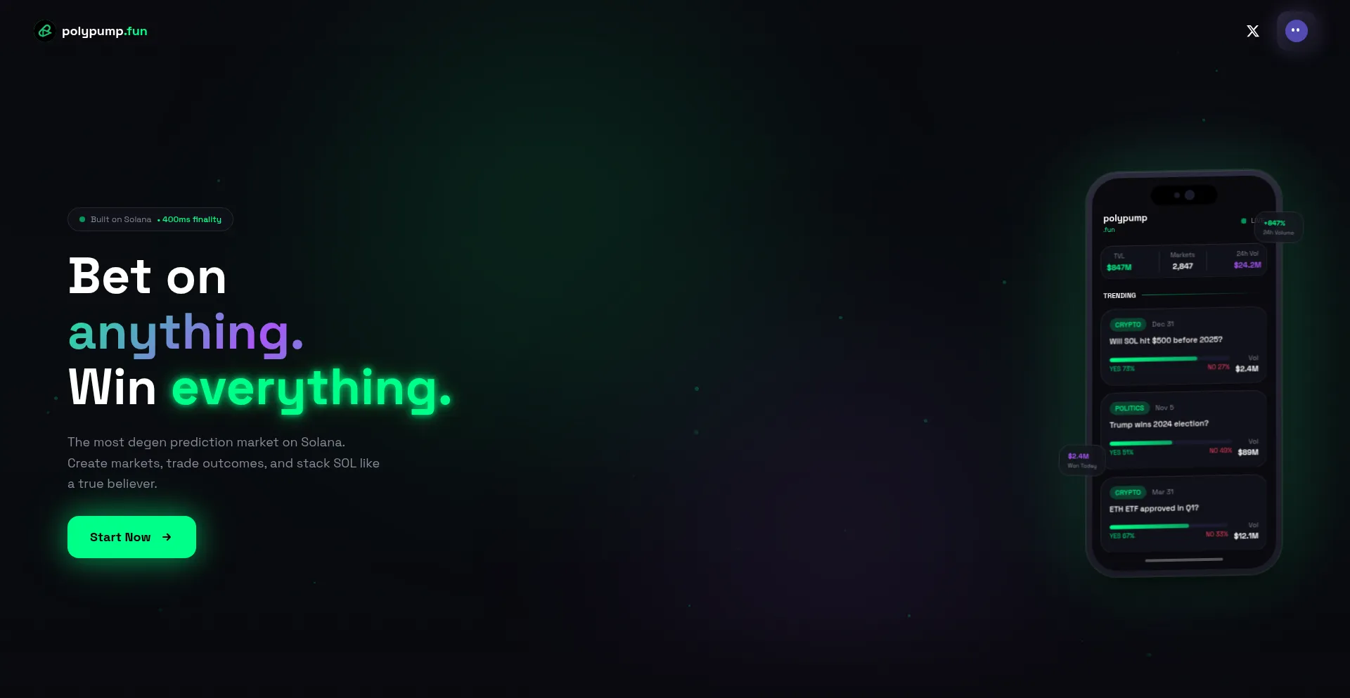 The most degen prediction market on Solana. Bet on anything. Win everything.