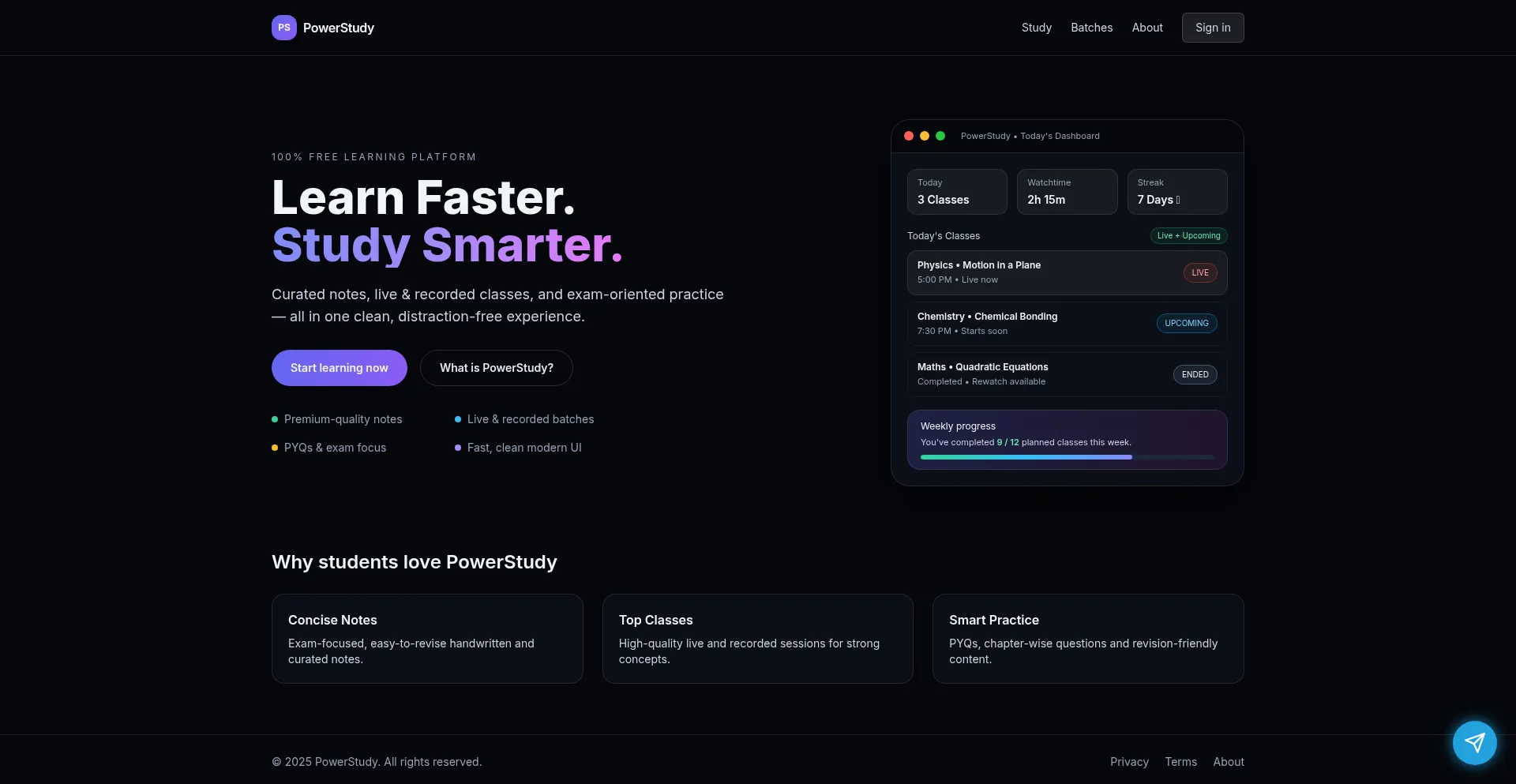 PowerStudy is free education platform offering infite Live Lectures, Notes, PYQs, batches, Exam Prepation for every student, clean, and accessible.