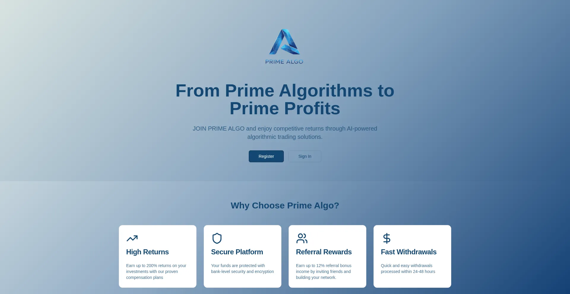 Join Prime Algo and start earning competitive returns on your investments with flexible compensation plans. Secure platform with fast withdrawals.