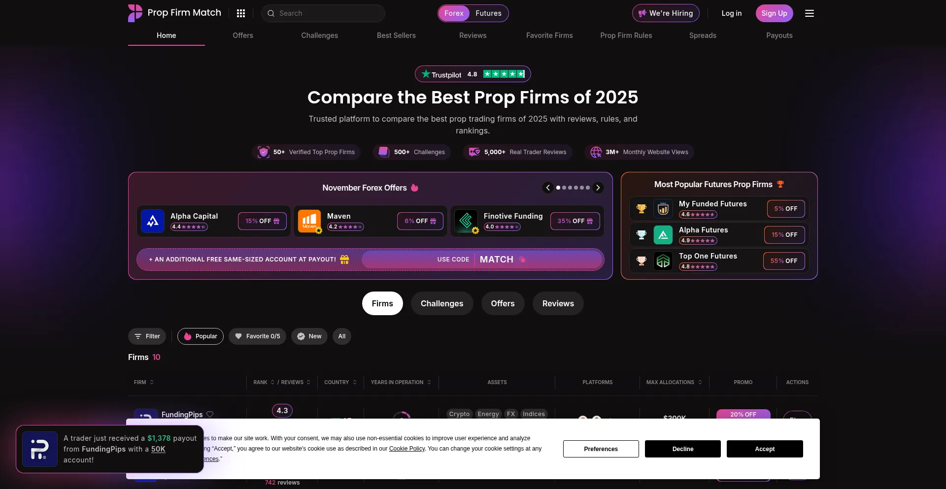 Compare the best prop trading firms of 2025 with Prop Firm Match, the leading comparison platform for reviews, rankings, rules, and profit splits.