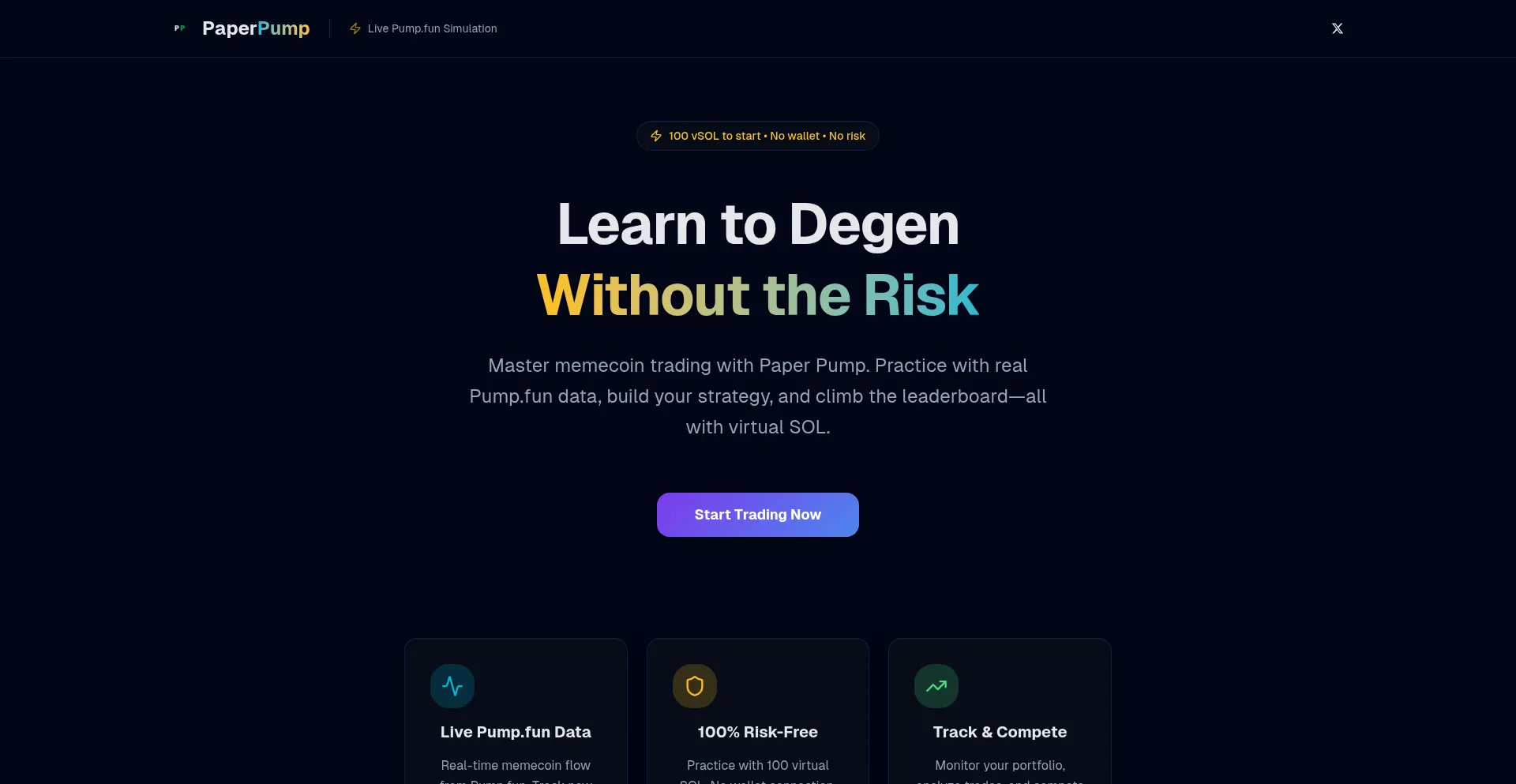 Practice trading Solana memecoins with virtual SOL. Real-time Pump.fun data, professional charts, zero risk. Learn to degen safely.