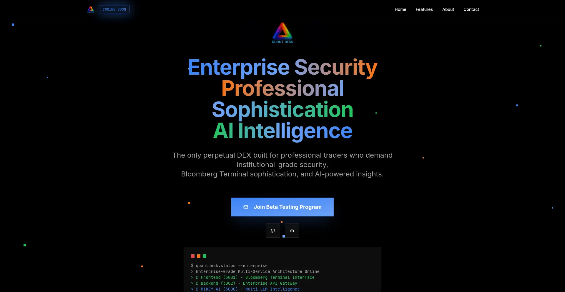 QuantDesk - The most advanced perpetual DEX on Solana. AI-powered trading, lightning-fast execution, and community rewards. Join the beta testing program now!