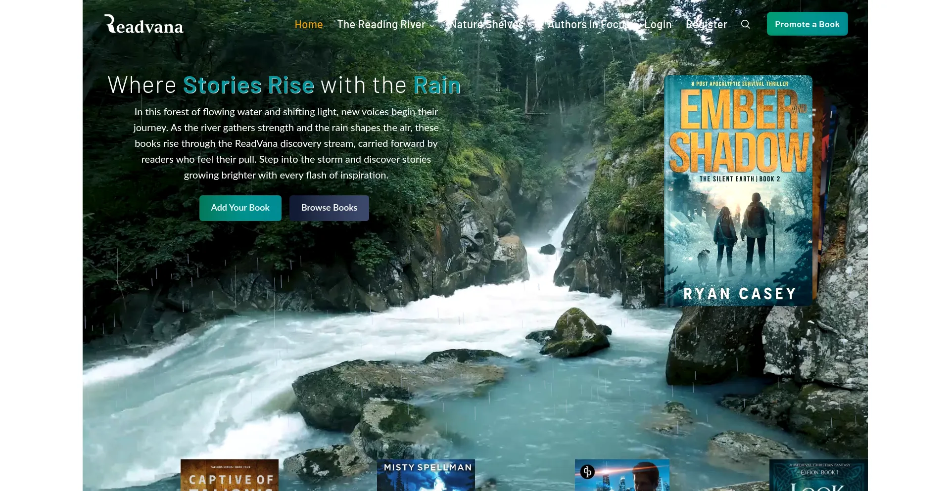ReadVana is a global book discovery platform shaped by forest flow, rainfall, and reader intent. Explore new books, rising titles, and standout authors, or list your own stories...