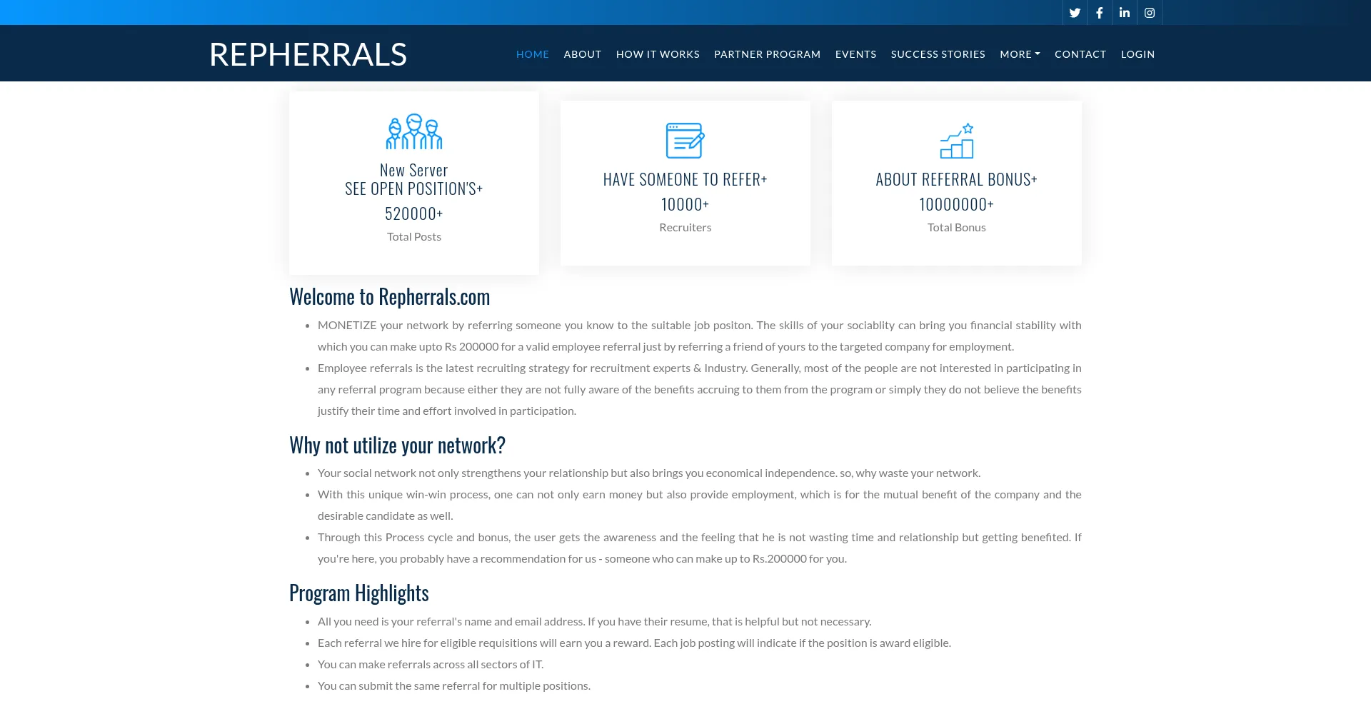 La présence de liens de médias sociaux sur le site web indique que repherrals.com maintient des comptes officiels sur les médias sociaux, ce qui est un signe positif de crédibilité et d'engagement.