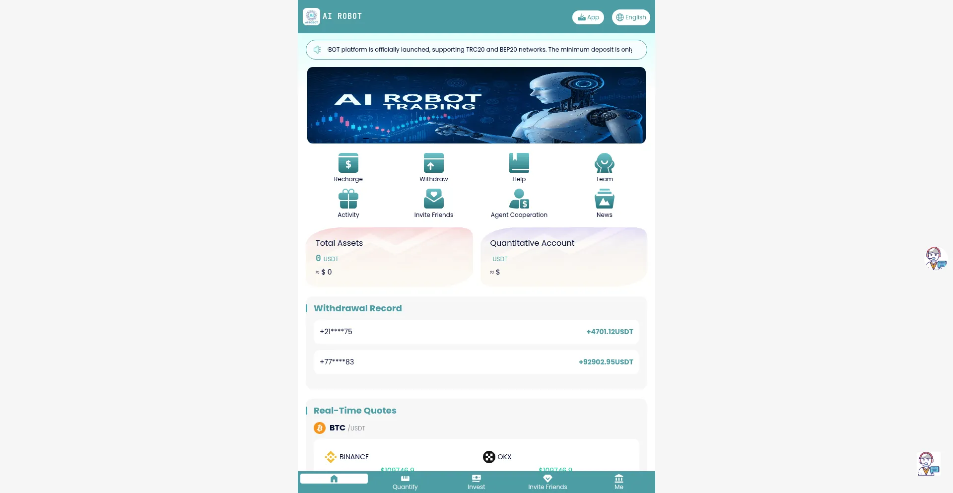 The AI ​​ROBOT platform is officially launched, supporting TRC20 and BEP20 networks.