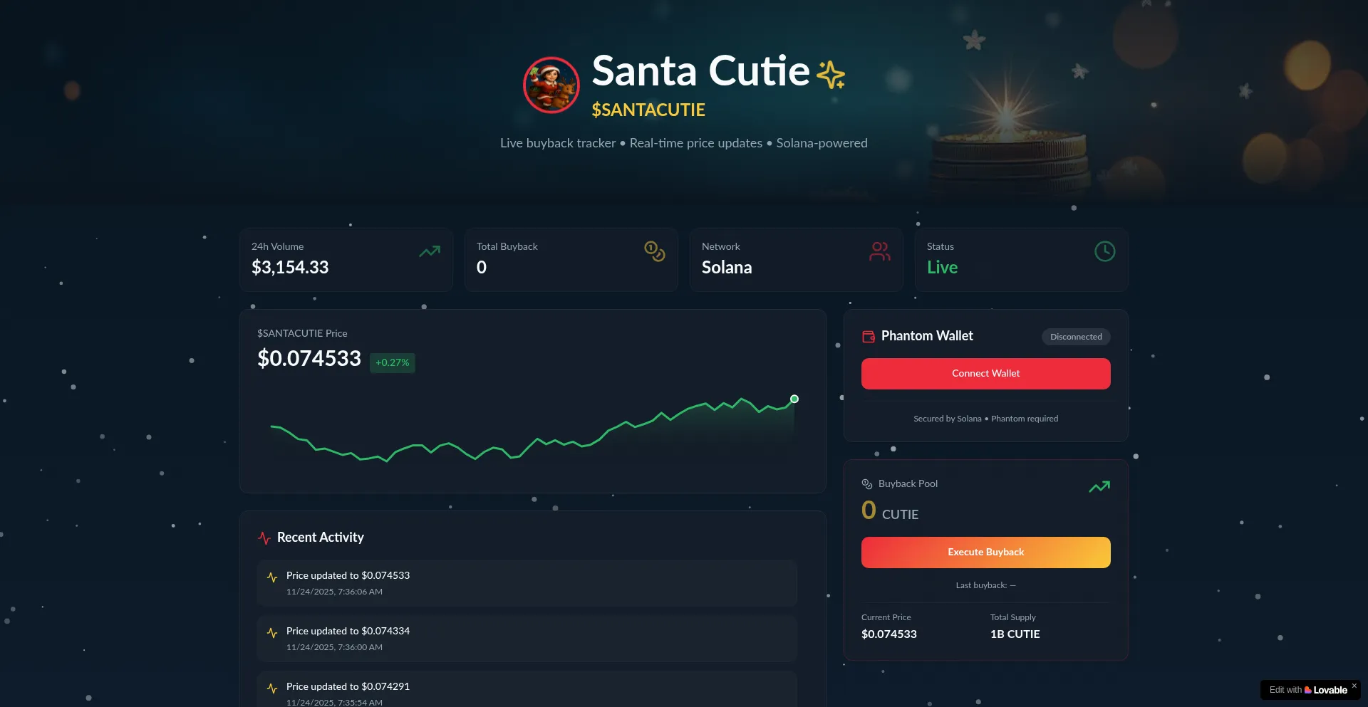 Real-time Santa Cutie ($SANTACUTIE) buyback tracker. Live price updates, wallet integration, and transparent buyback execution on Solana.