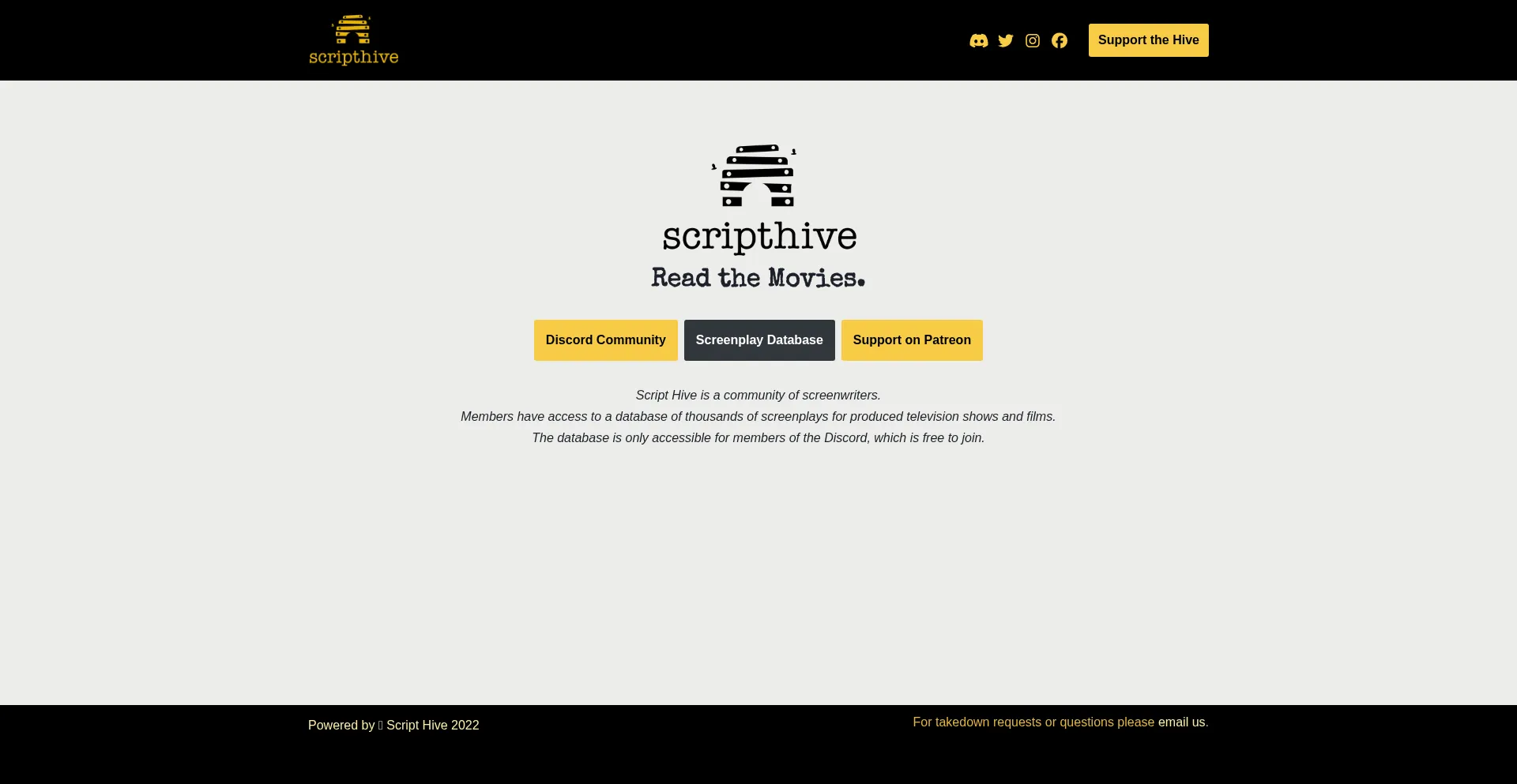 Script Hive is a community of screenwriters. Members have access to a database of thousands of screenplays for produced tv shows and films. 🐝 #readthemovies