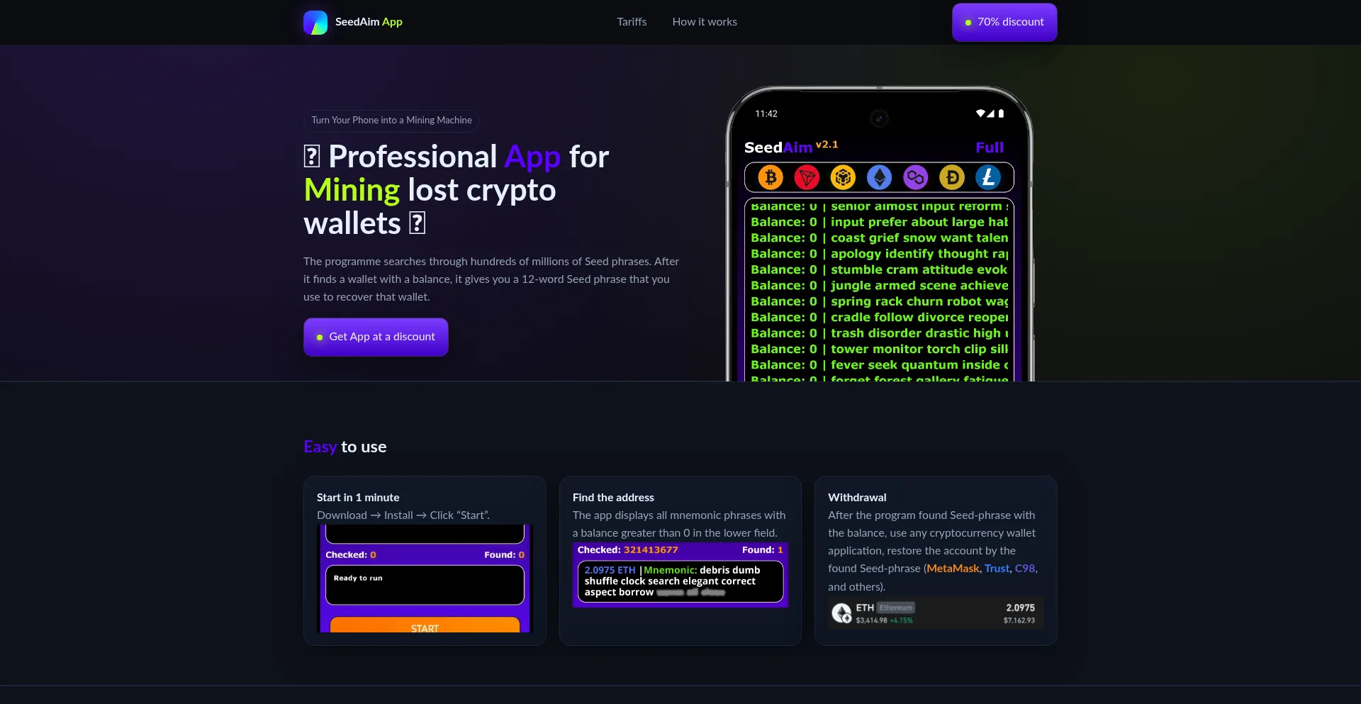 Seed Aim app searches through hundreds of millions of Seed phrases. After it finds a wallet with a balance, it gives you a 12-word Seed phrase that you use to recover that wallet.