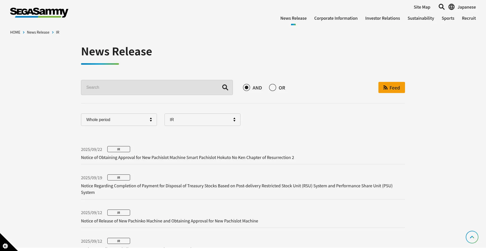 IR news and information of SEGA SAMMY HOLDINGS INC. are described.