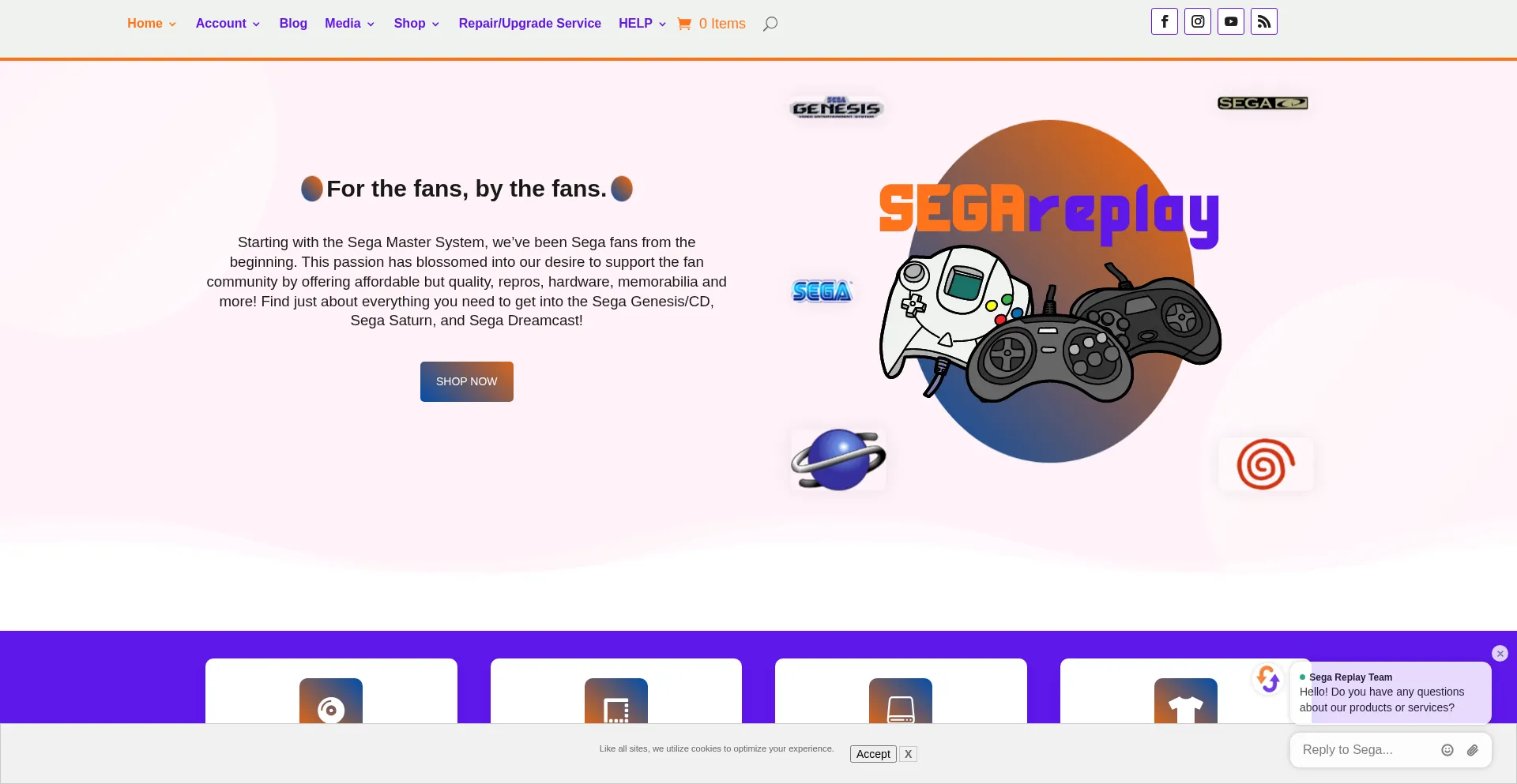 Sega retro shop for Sega Genesis, Sega CD, Sega Saturn, and Sega Dreamcast. Get reproduction games, cases/boxes, hardware, and memorabilia. Repair service for Sega hardware.