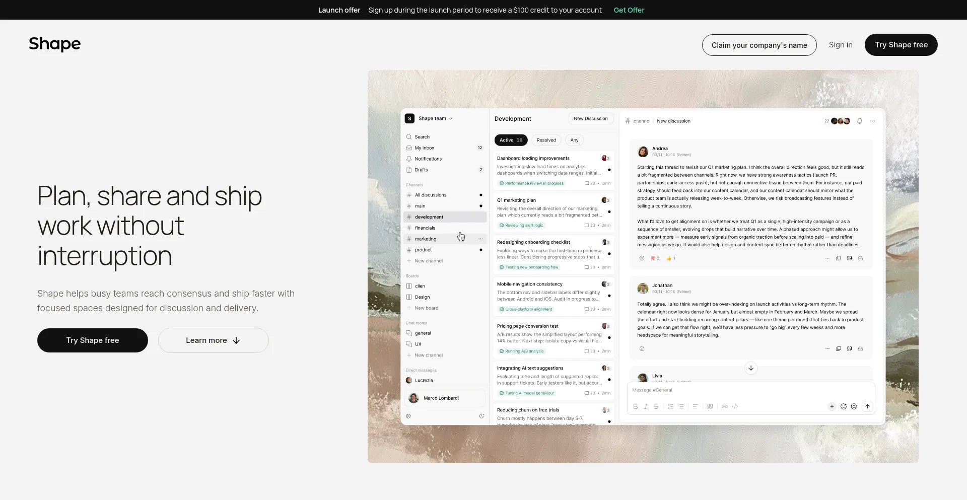 Shape helps teams move beyond chaotic chat by encouraging thoughtful, long-form collaboration that keeps knowledge inside the organization.