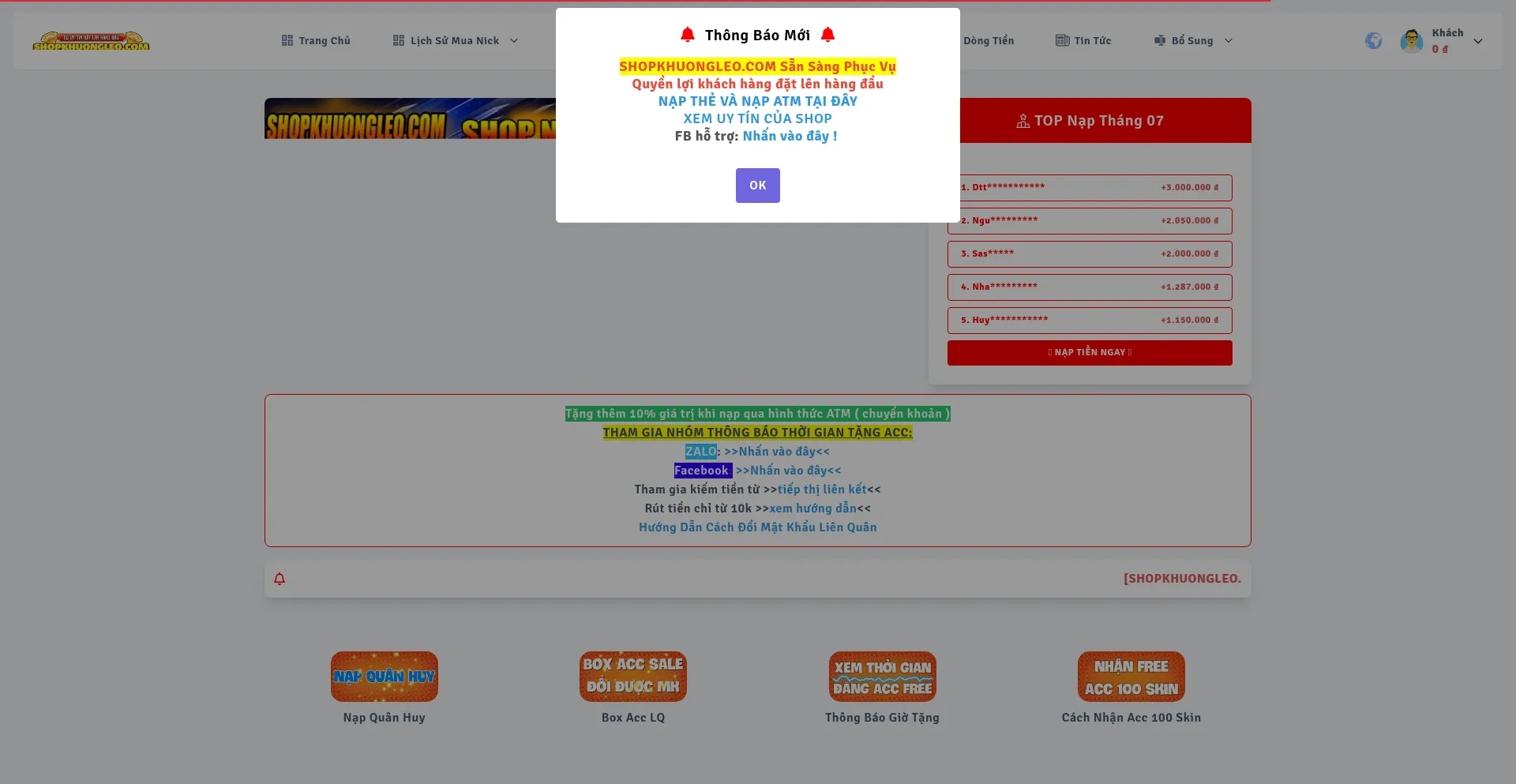 Shopkhuongleo.Com là hĂȘÌŁ thĂŽÌng shop acc liĂȘn quĂąn & acc free fire tÆ°ÌŁ Ä‘ĂŽÌŁng, uy tín, thĂŽng tin liĂȘn hĂȘÌŁ rõ ràng, Ä‘ĂąÌ€y đủ. MĂŽÌƒi chuyĂȘn muÌŁc game...
