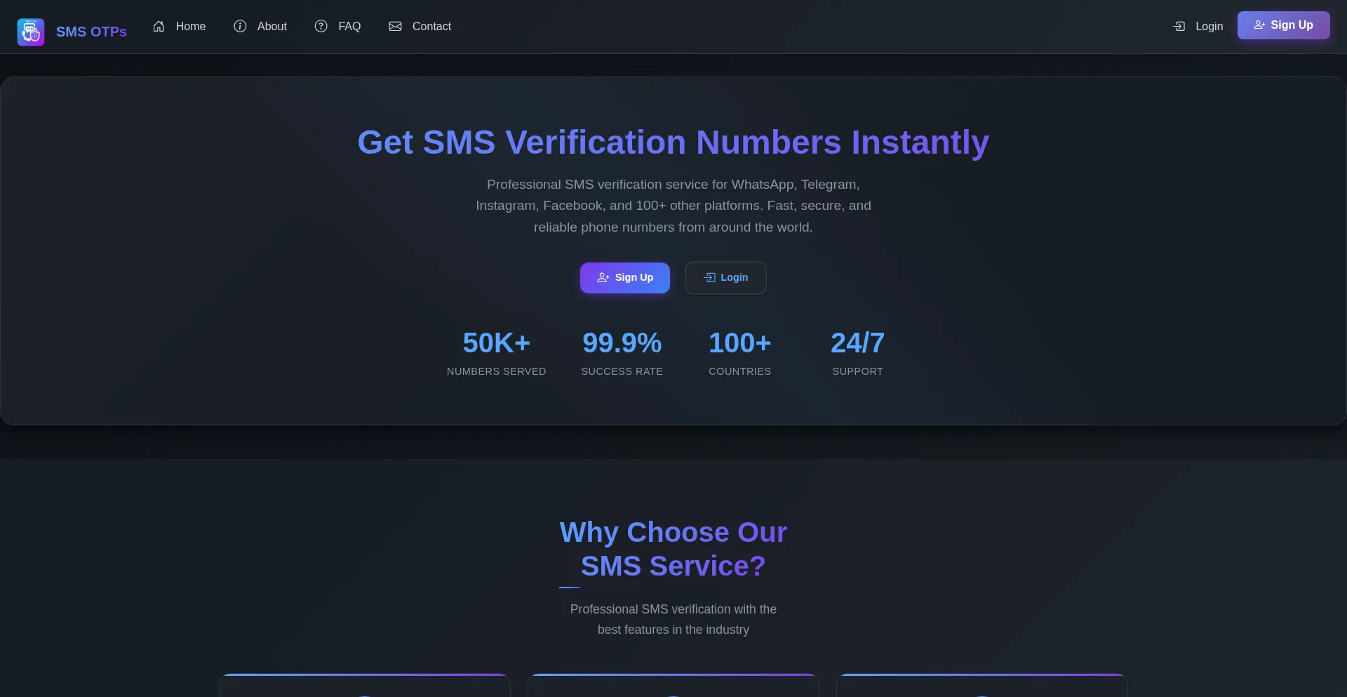 Get instant SMS verification phone numbers for WhatsApp, Telegram, Instagram, Facebook, Google, Twitter, Discord and 100+ services. Receive OTP codes instantly. Available in 100...