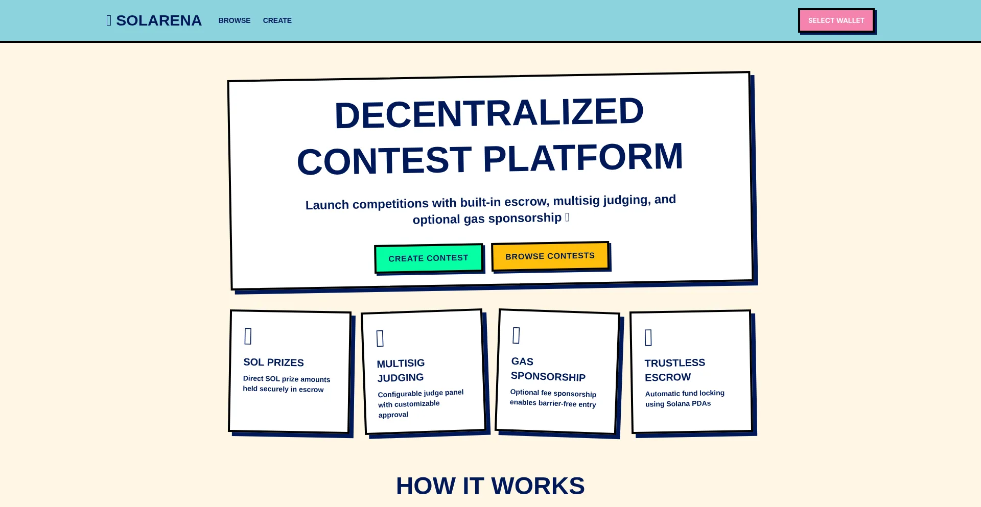 A gas-free contest platform built on Solana with multisig judging and escrow