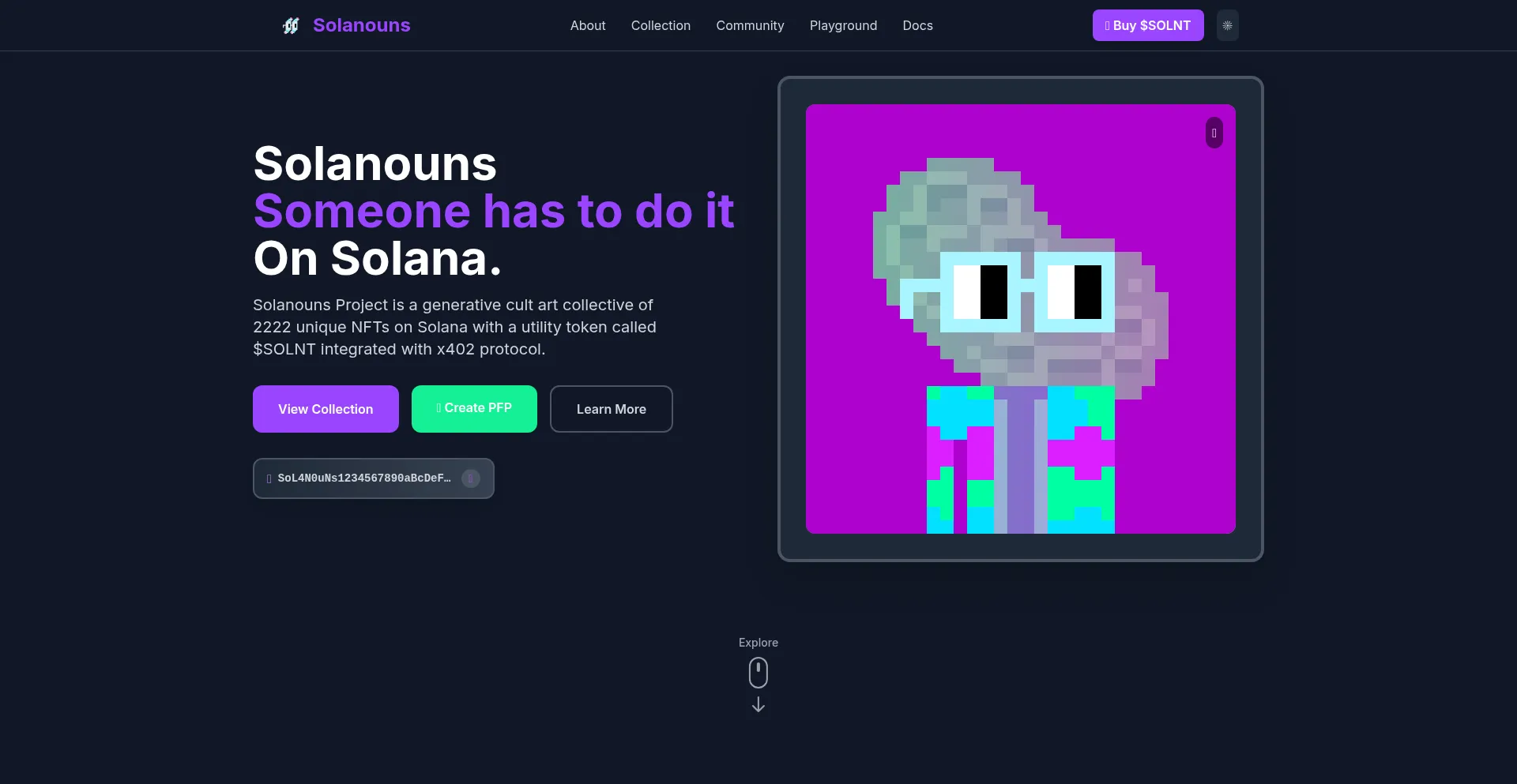 Solanouns Project is a generative cult art collective of 2222 unique NFTs on Solana with a utility token called $SOLNT integrated with x402 protocol. Join our DAO-governed commu...