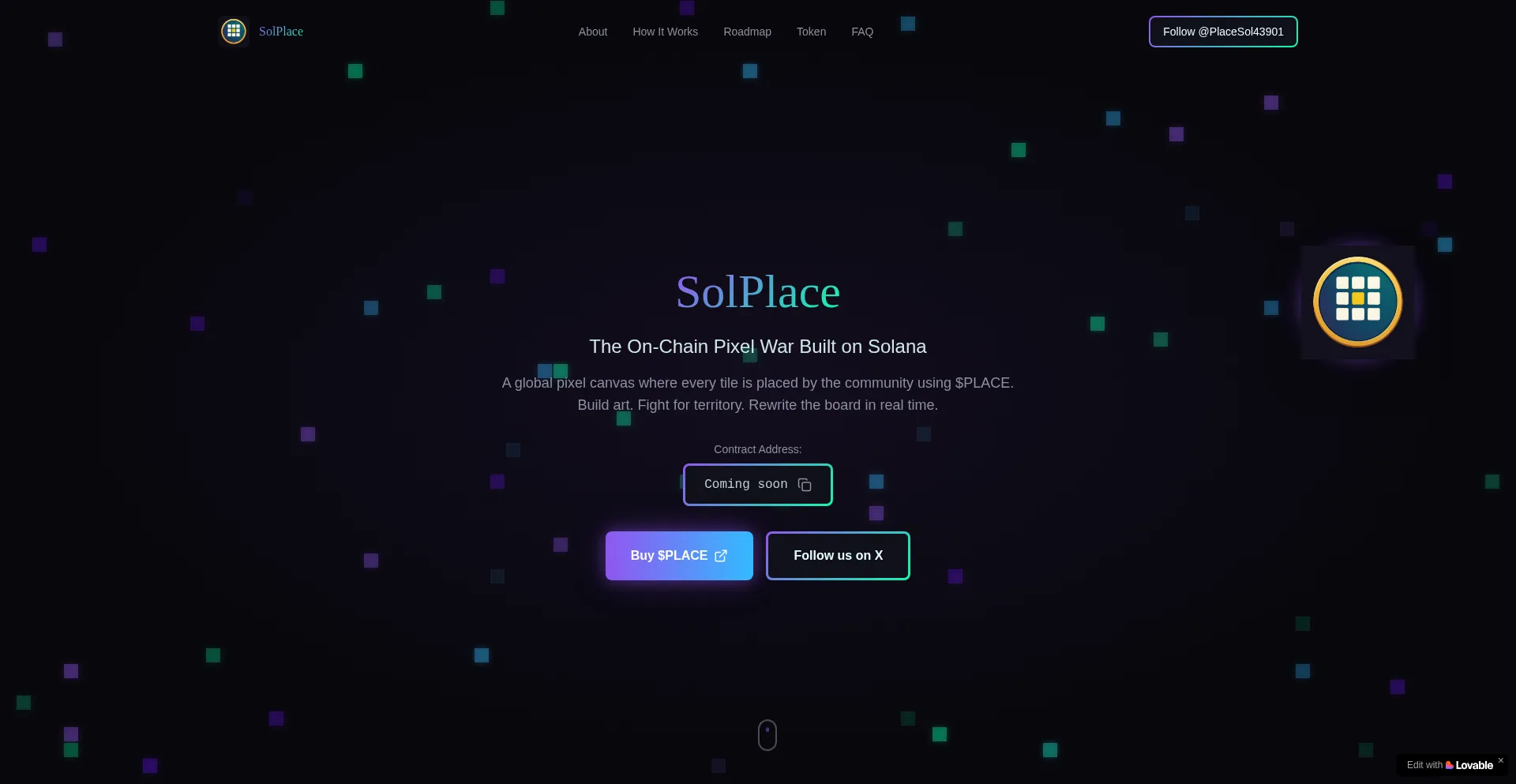 SolPlace is an on-chain pixel war game built on Solana. Join the global canvas, place pixels with $PLACE tokens, and fight for territory in real-time.