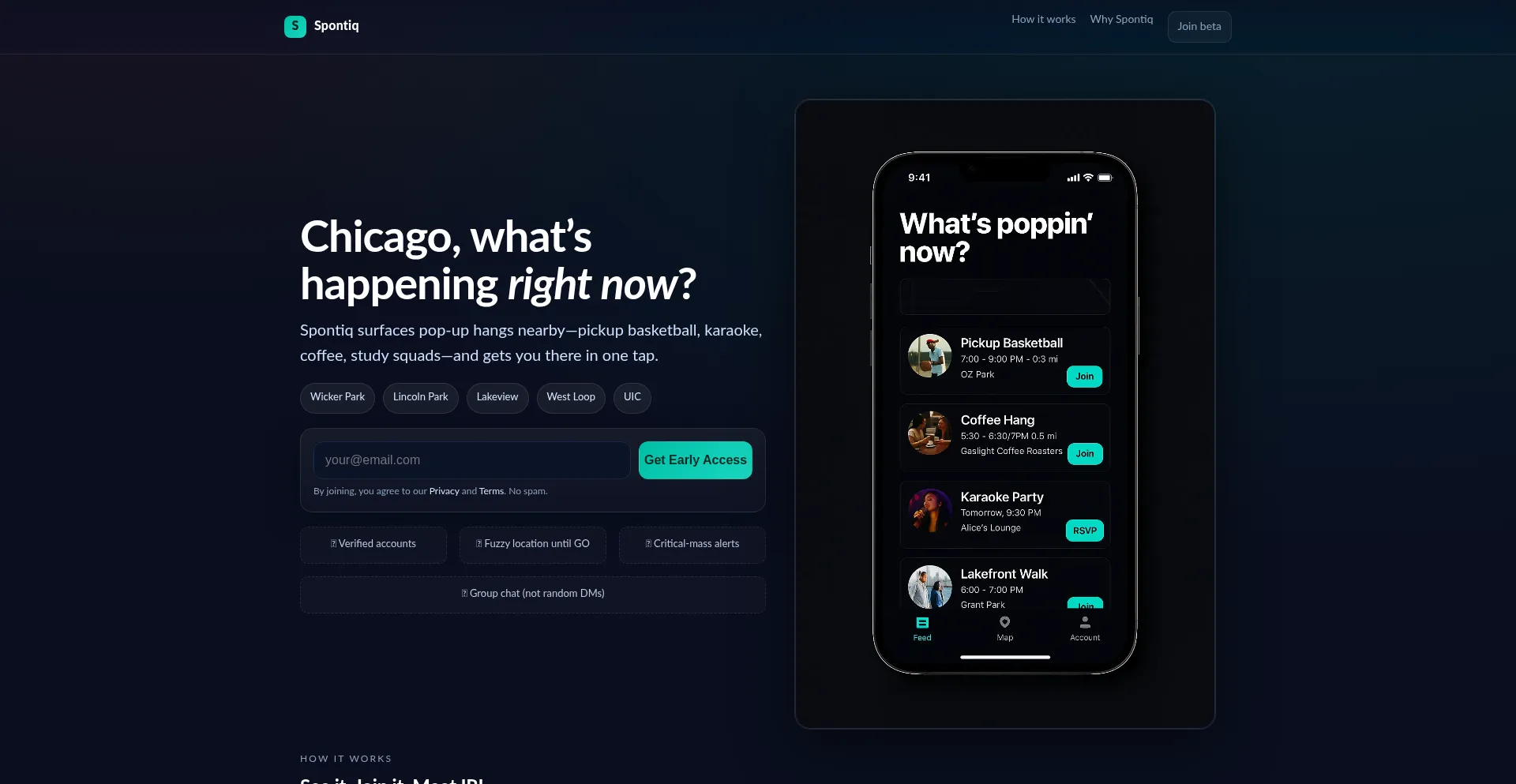 Find what’s happening near you right now in Chicago. Spontiq surfaces pop-up hangs—basketball, karaoke, coffee, study squads—and gets you there in one tap.