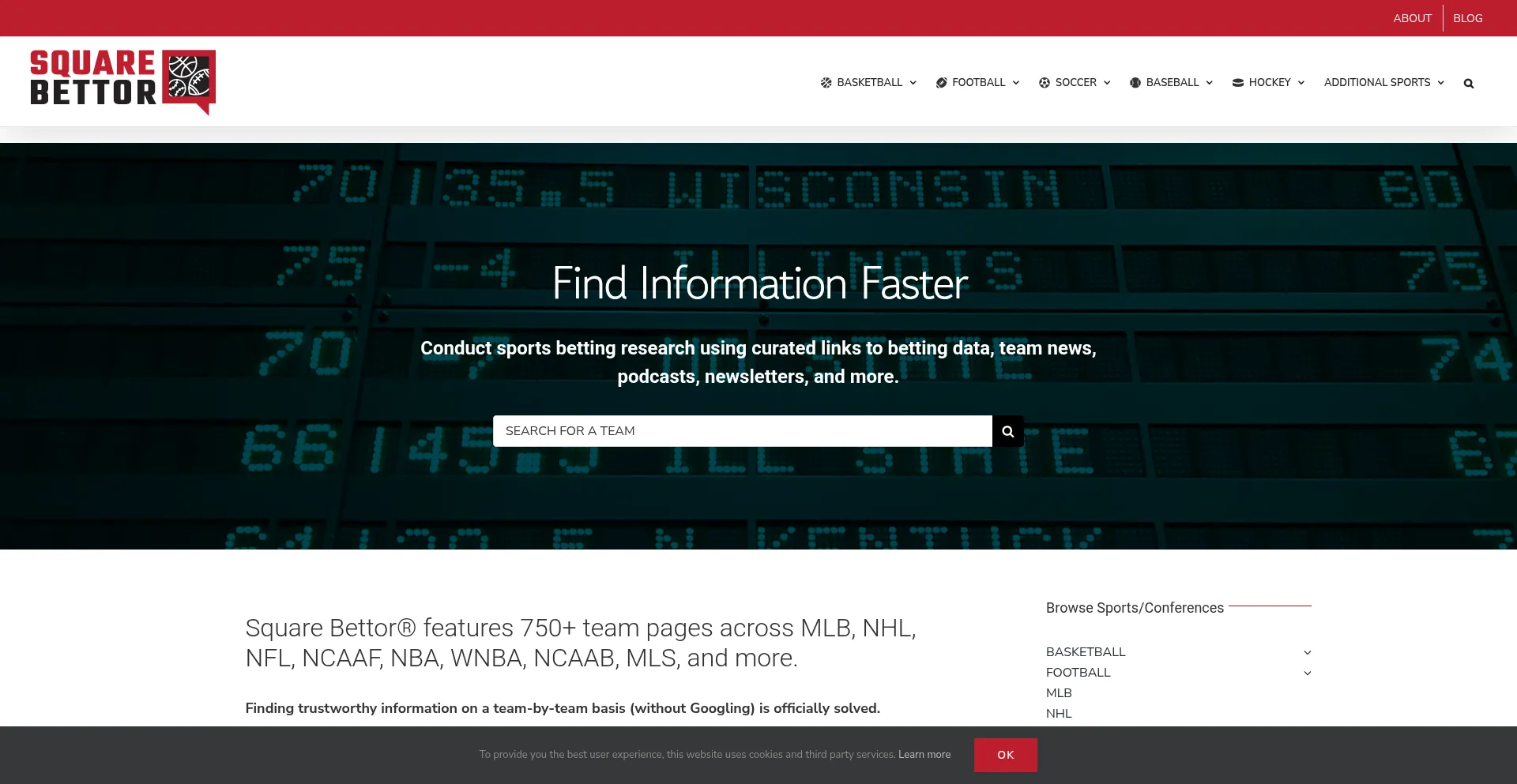 Square Bettor is a sports betting research platform that curates links to betting data, podcasts, newsletters and more for 750+ teams.