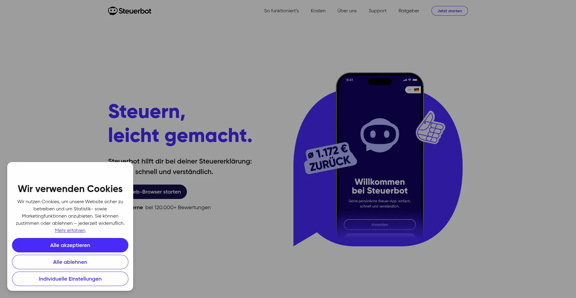 Steuerbot hilft dir bei deiner SteuererklĂ€rung: einfach, schnell und verstĂ€ndlich. Sichere dir im Schnitt 1.172 € RĂŒckerstattung.