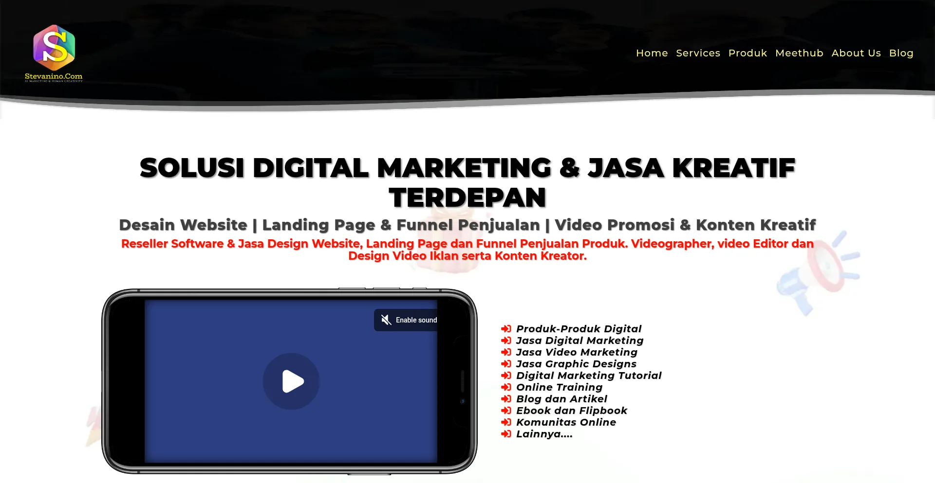 Solusi Digital Marketing & Jasa Kreatif Terdepan. Kami adalah Reseller Software & Jasa Design Website, Landing Page dan Funnel Penjualan Produk. Videographer, video Editor dan D...