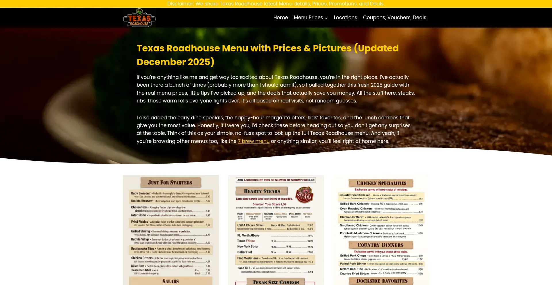 Complete Texas Roadhouse menu with prices, pictures & must-try dishes. Updated December 2025 — check steaks, ribs, combos & kids menu.