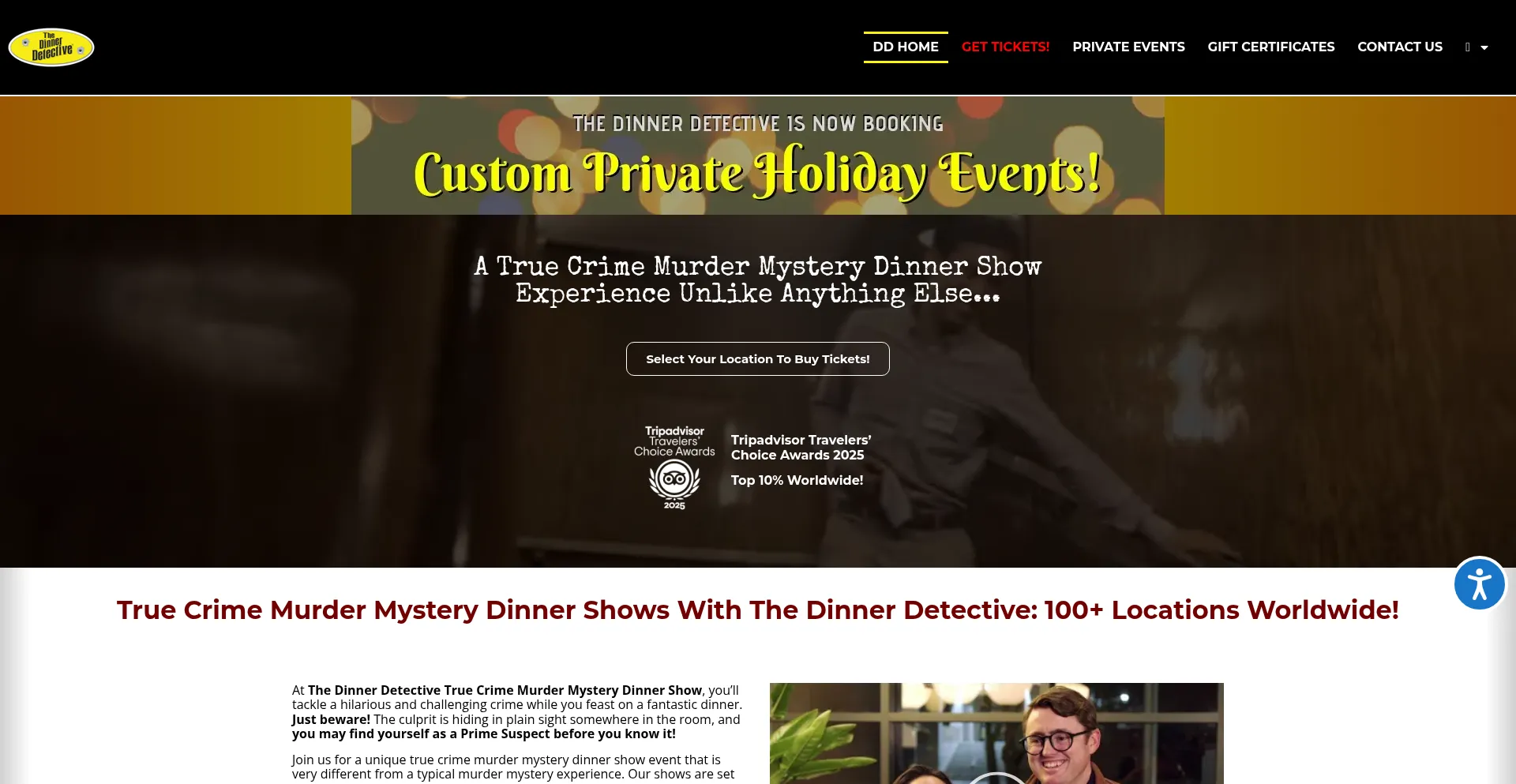 Murder mystery dinner shows with a twist! Now playing in 100+ cities. Hilarious show, great meal! Private events and gift certificates!