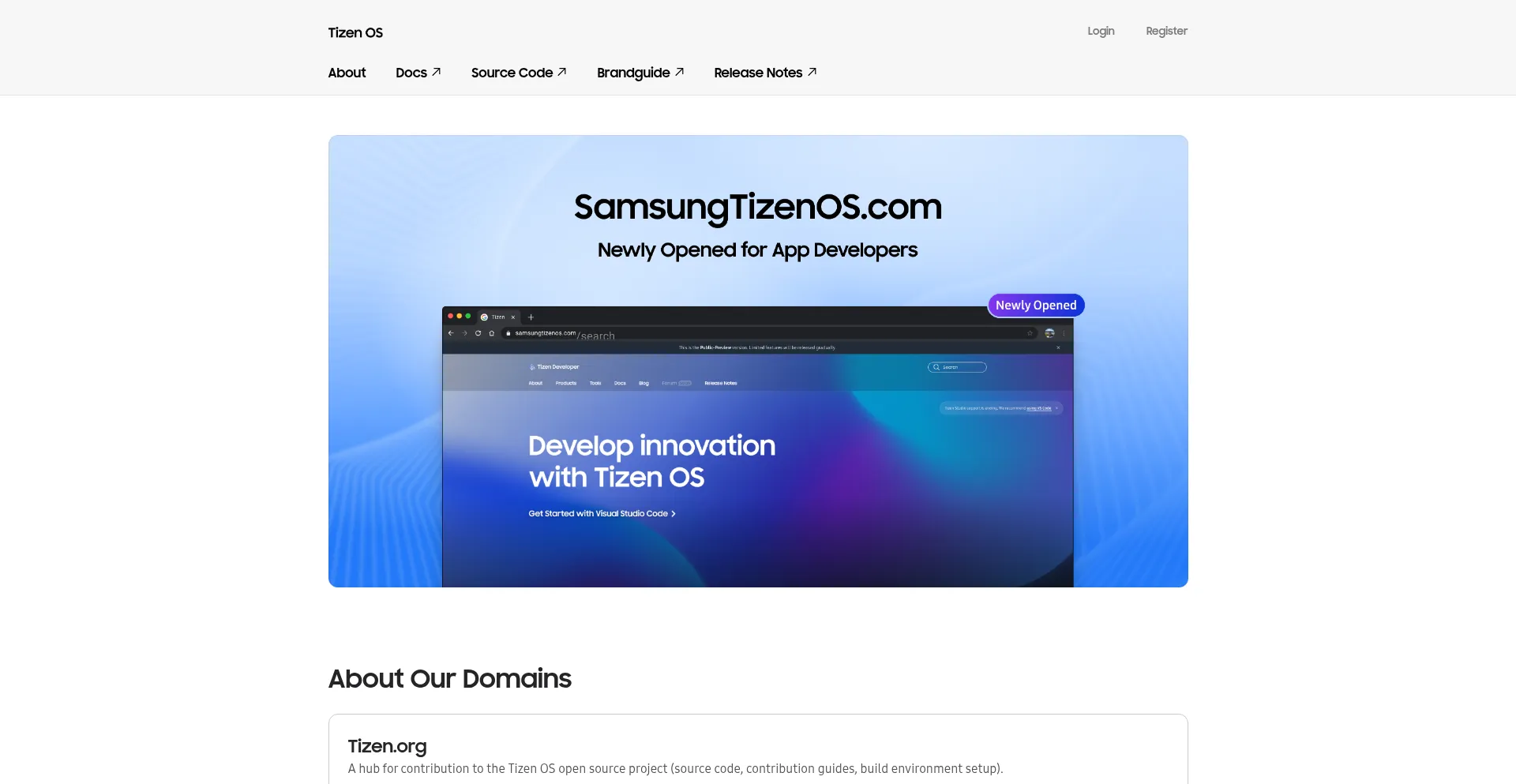 Le site web tizen.org est configuré comme une application web avec fonctionnalités d'application mobile. Les utilisateurs peuvent installer ce site directement sur l'écran d'accueil de leur appareil pour un accÚs rapide et une expérience similaire à une application.