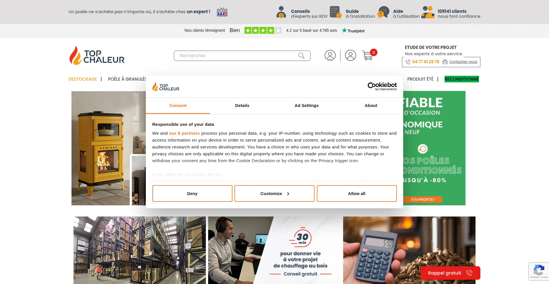 Le site web a un bon score Trustpilot (4.2) basé sur 4785 avis, indiquant un niveau élevé de confiance de la part des clients.