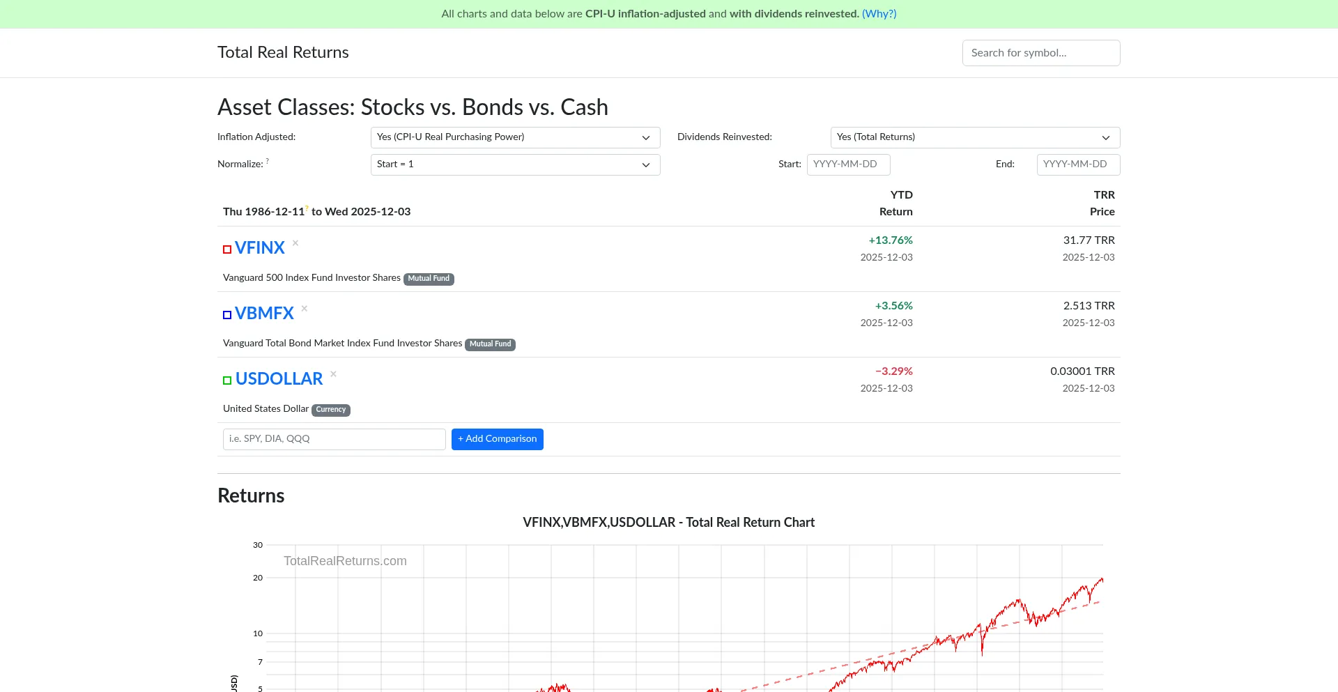 All stock charts and quotes on Total Real Returns are CPI-U inflation-adjusted and with dividends reinvested. See how your real purchasing power changes over time.
